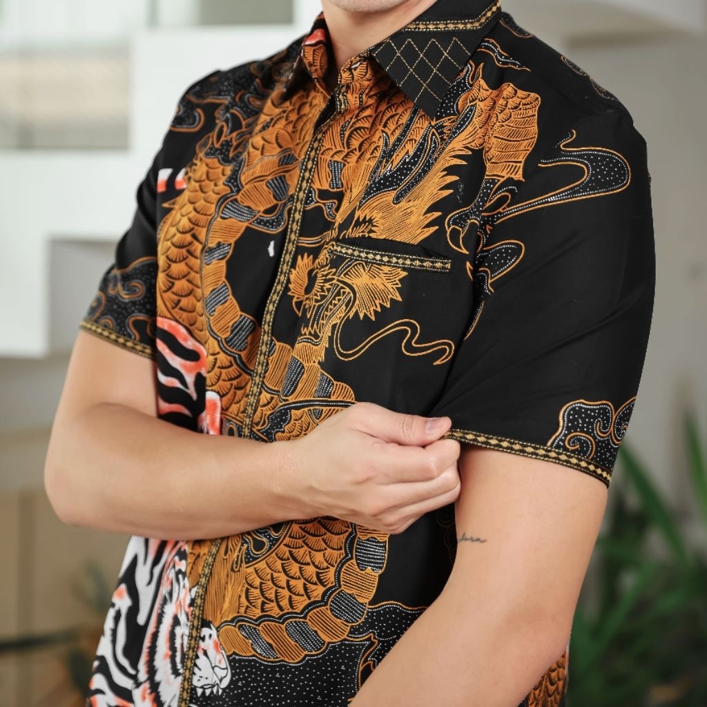 Batik Pria Hem Smock Bordir B485 Kemeja Baju Reguler Fit Bahan Katun Motif Harimau Naga Perabu.id