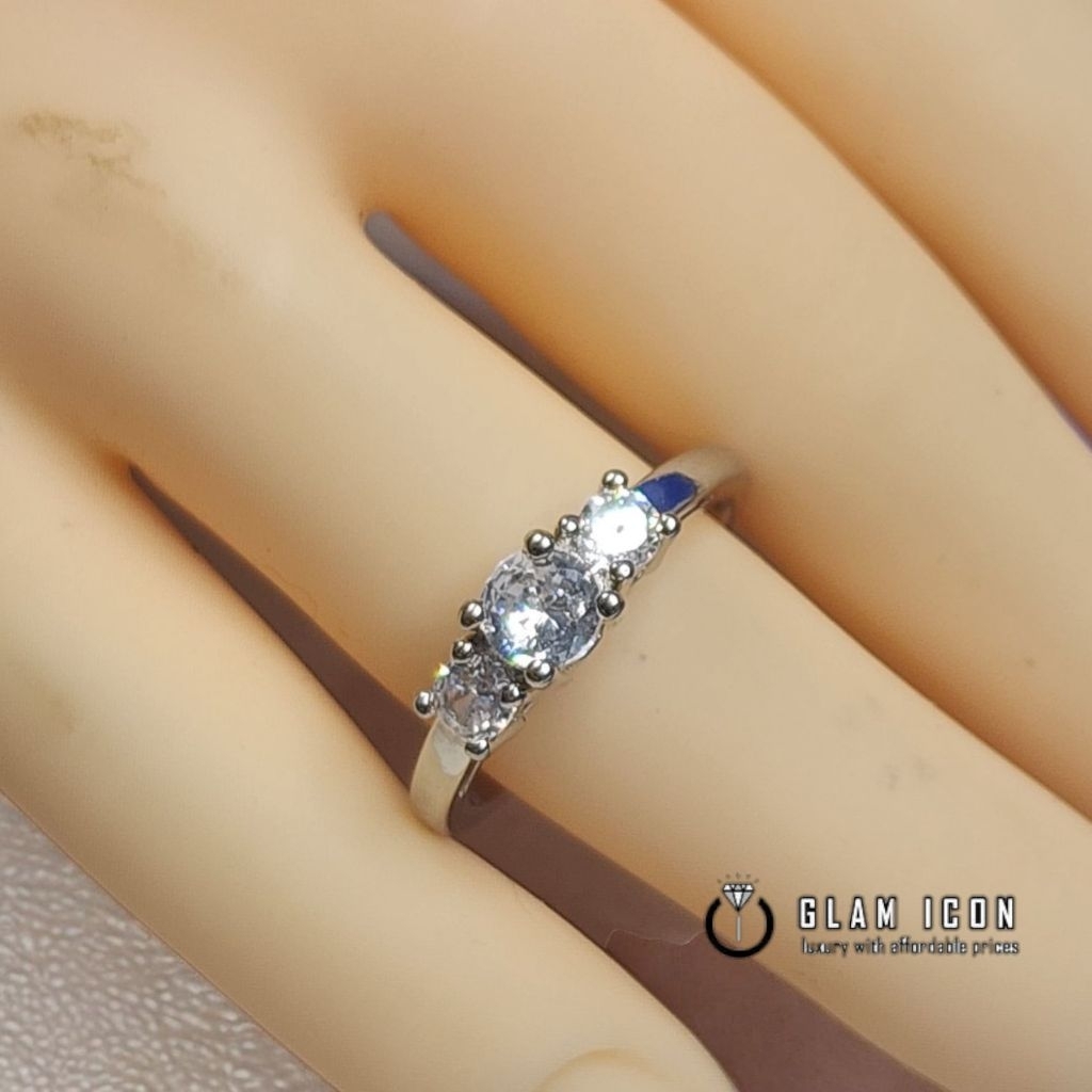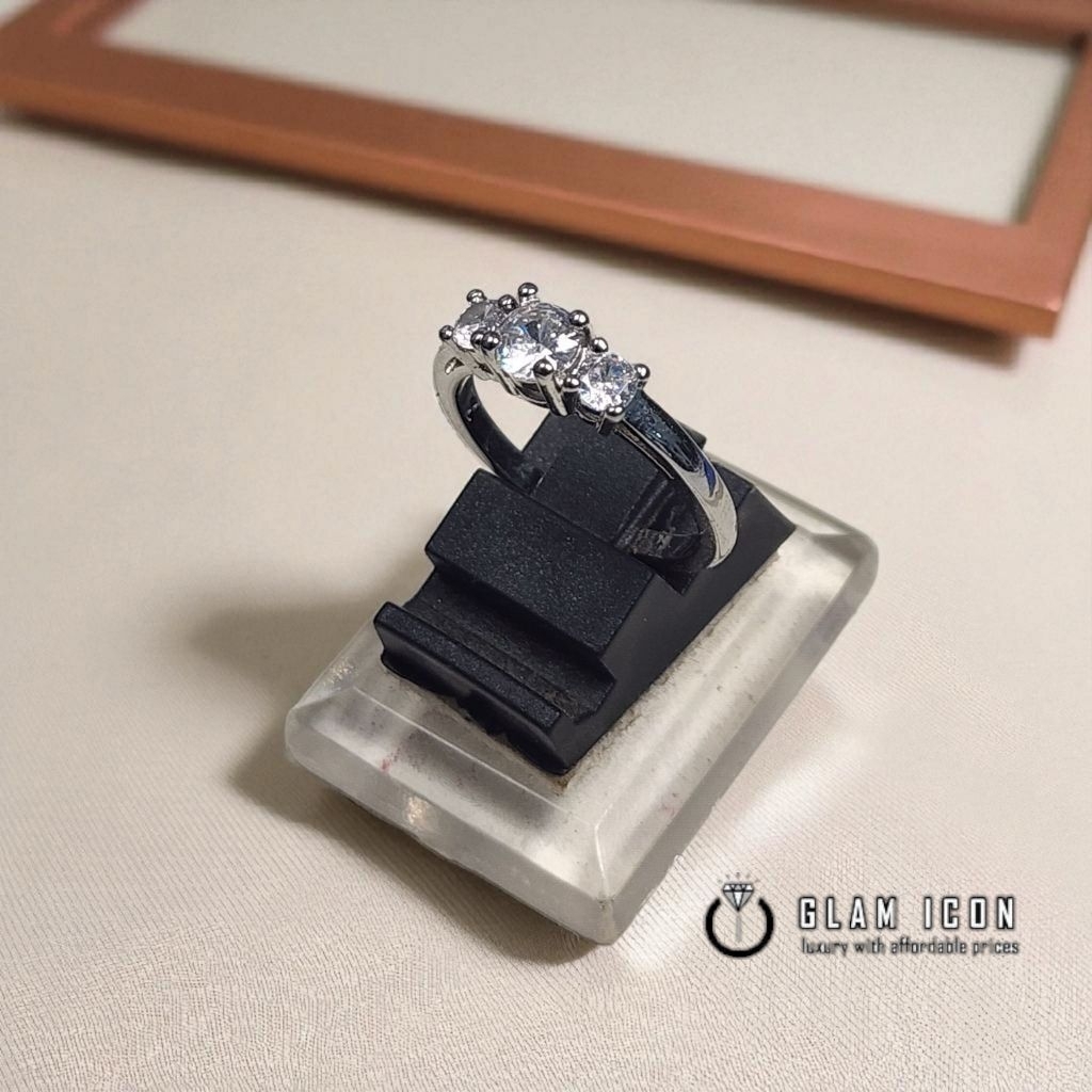 "Cincin Wanita Elegan Silver Rhodium dengan 3 Batu Berlian Zirconia – Glam Icon Perhiasan Mewah Terjangkau