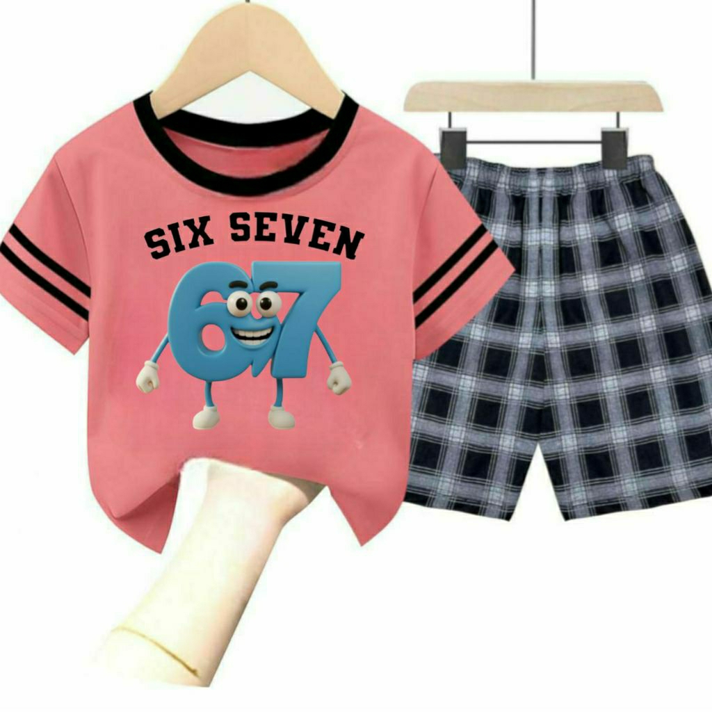 Setelan Baju Kaos Anak GAMBAR ANOMALI SIX SEVEN/ Baju Anak Celana Kotak Kotak 2 -9 Thn S M L XL