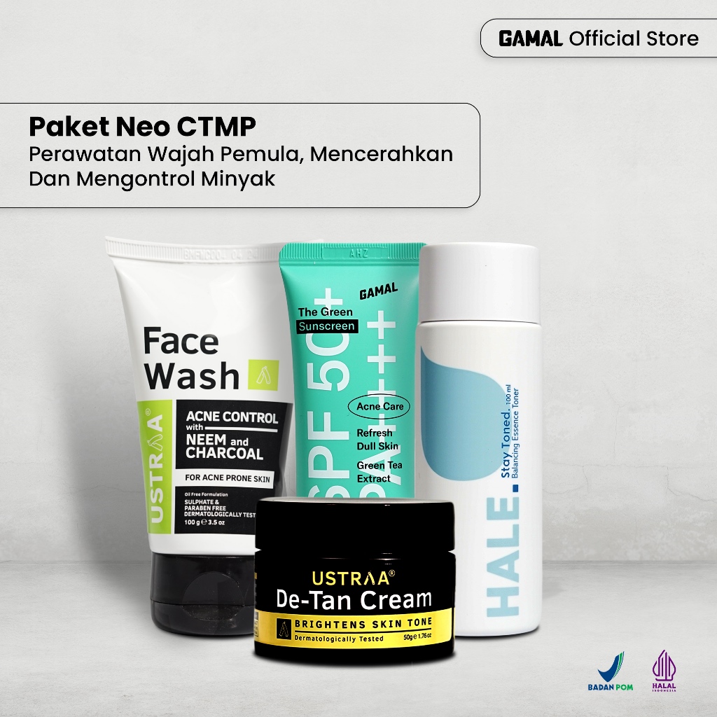 GAMAL | Paket Neo CTMP | Ustraa Face Wash Neem & Charcoal 100gr, Ustraa De-Tan Cream 50gr, Hale Stay Toned Essence Toner 100ml & The Green Sunscreen 30ml SPF 50+ PA++++ | Perawatan Wajah Pemula, Mencerahkan Dan Mengontrol Minyak