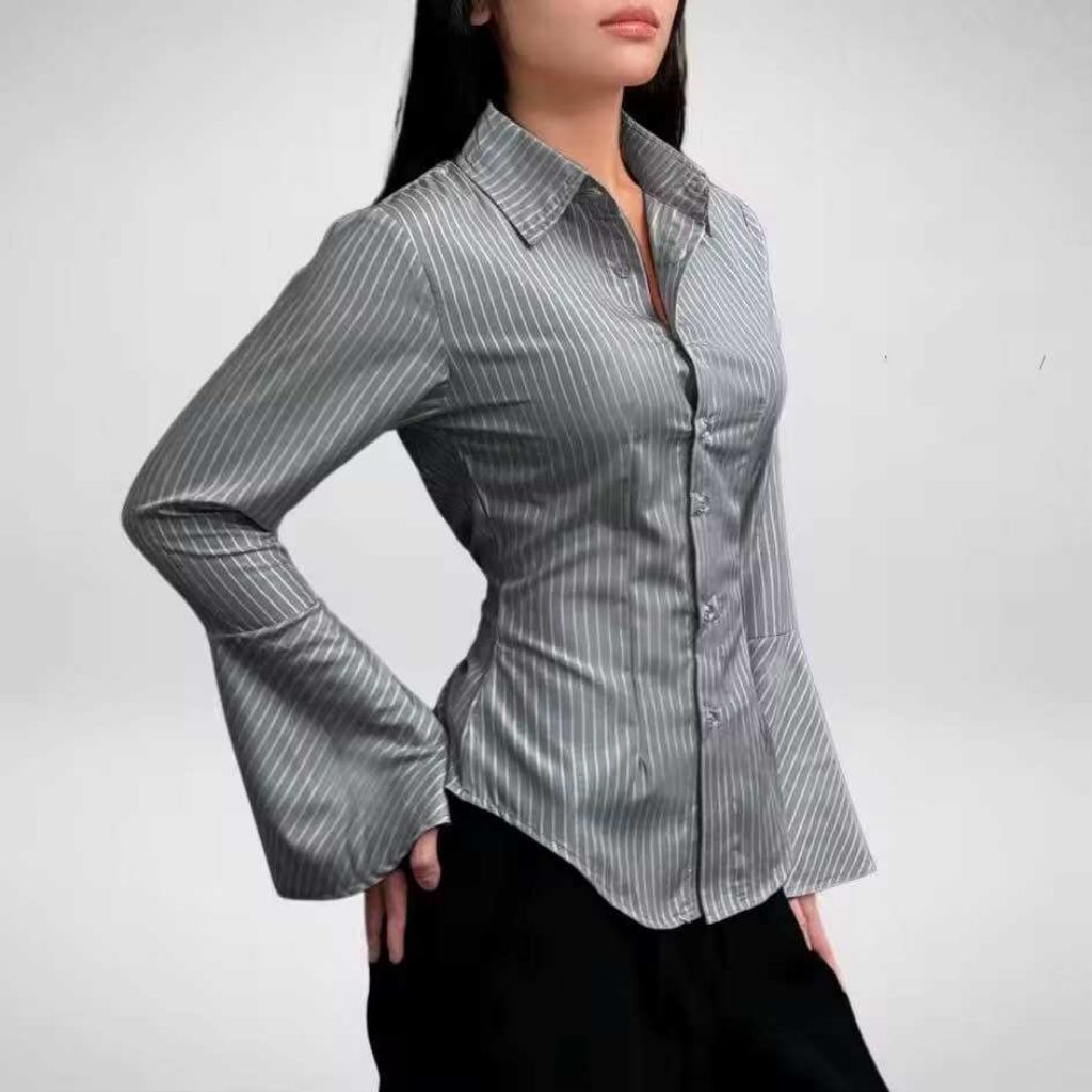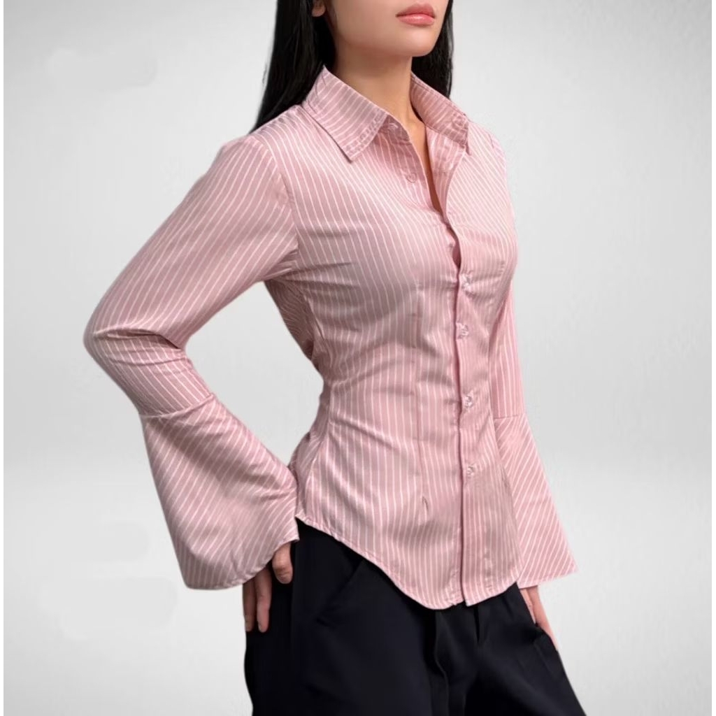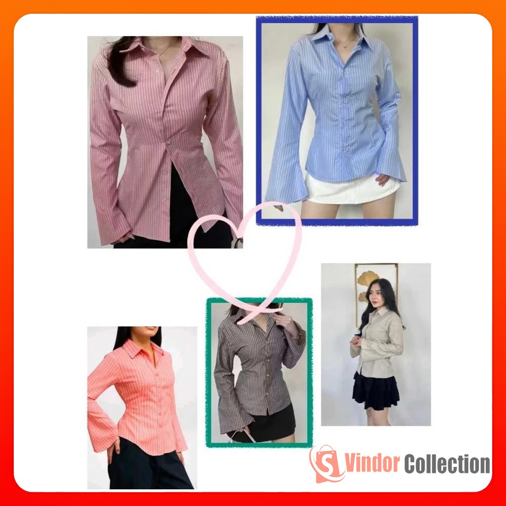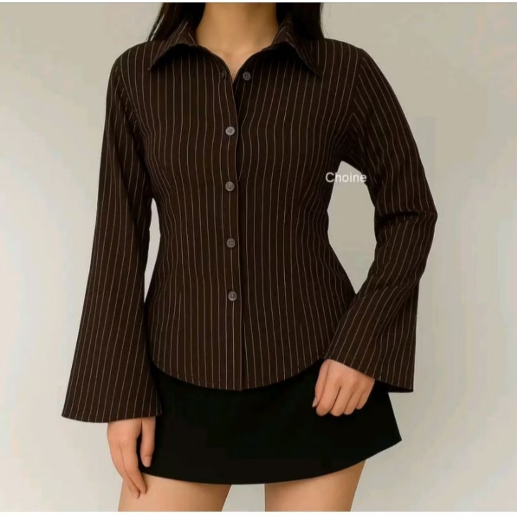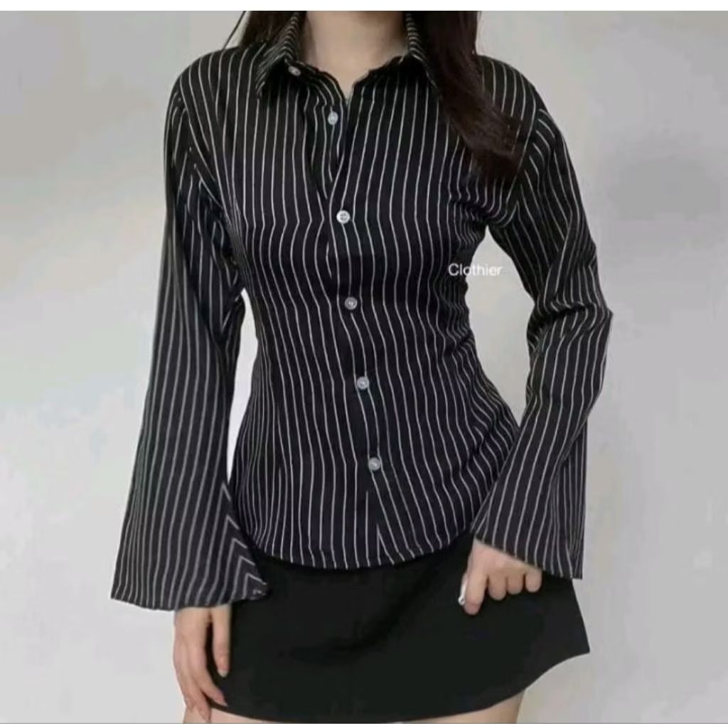Kemeja Wispie Money Magnet Fitted Shirt / Kemeja Kerja Wanita Press Body Pinstripe Salur Berkaret