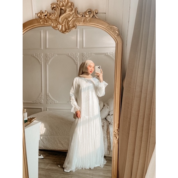 READY STOK!! SYAKIRA DOTTY DRESS - BROKEN WHITE / dress pesta murah wedding dress