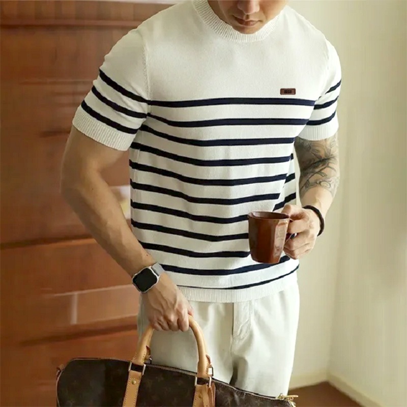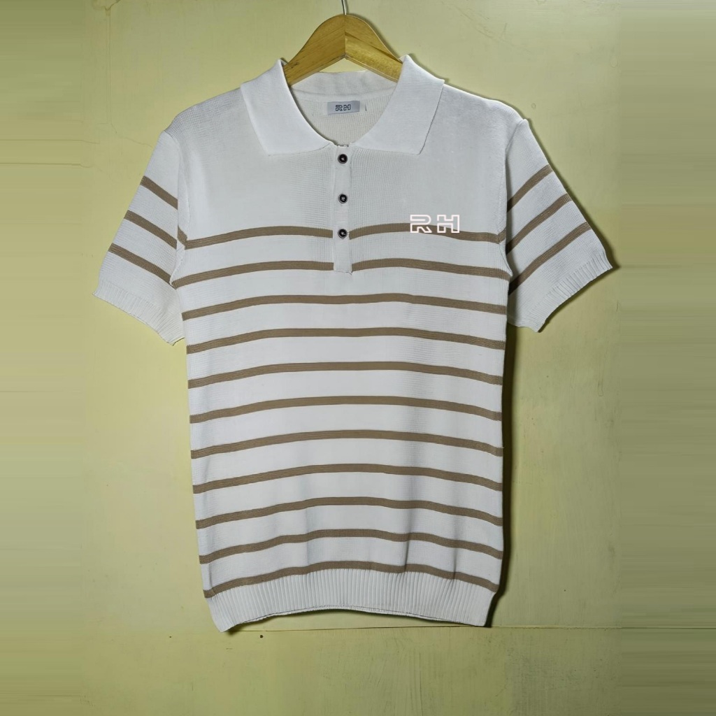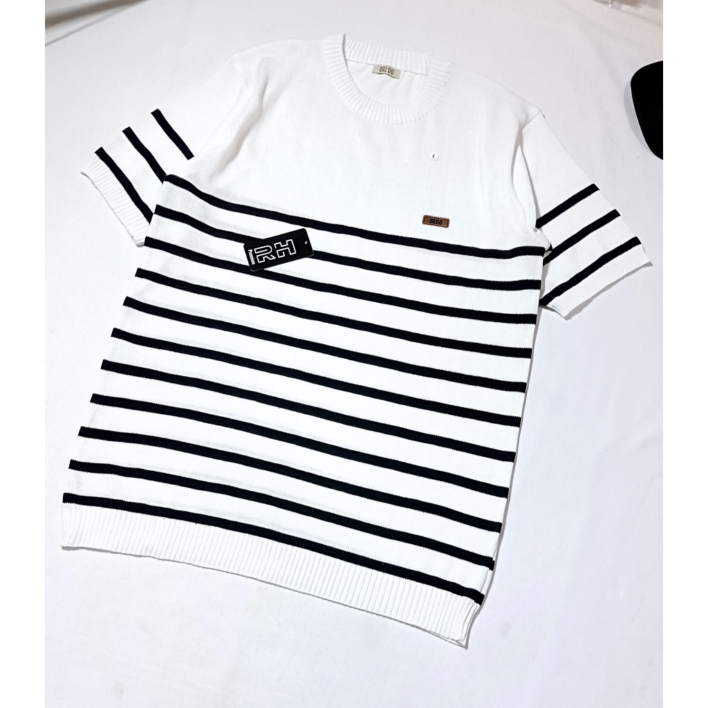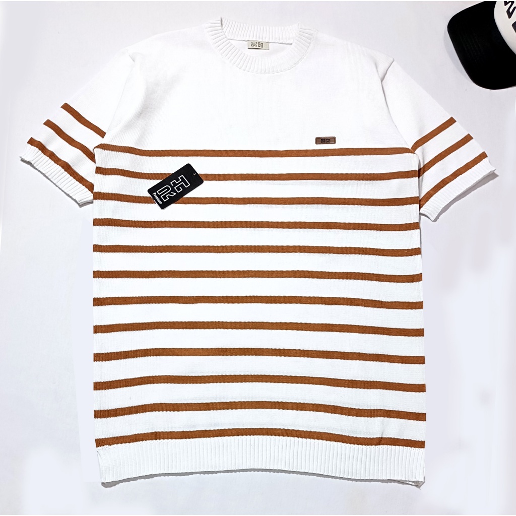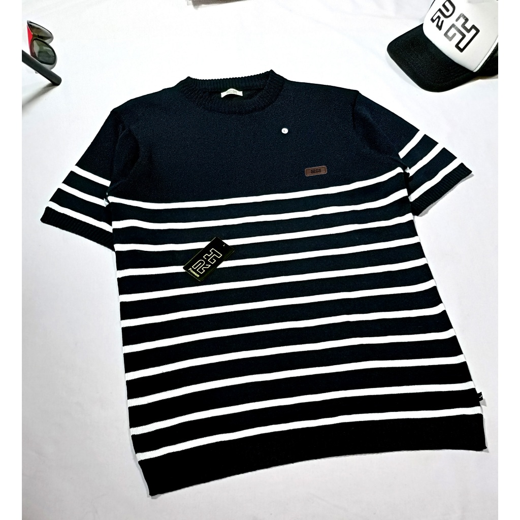 RHcollections baju rajut pria lengan pendek kerah bulat crewneck motif setrip belang garis mewah elegan Hitam Putih coral top terbaru