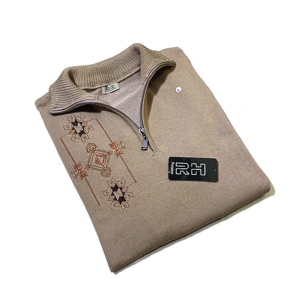 Baju rajut koko pria warna coksu kerah resleting zipper zipko RH motif bordiran Geometris modern leher tinggi turtleneck tangan panjang katun