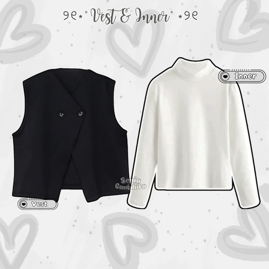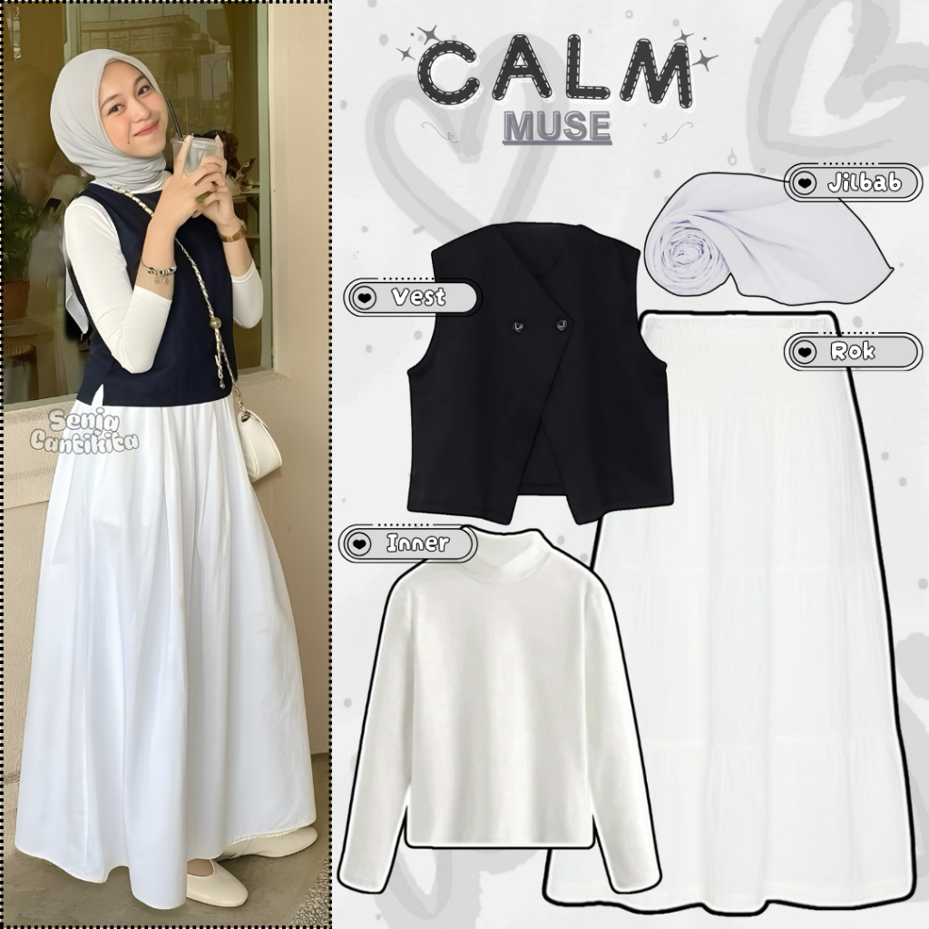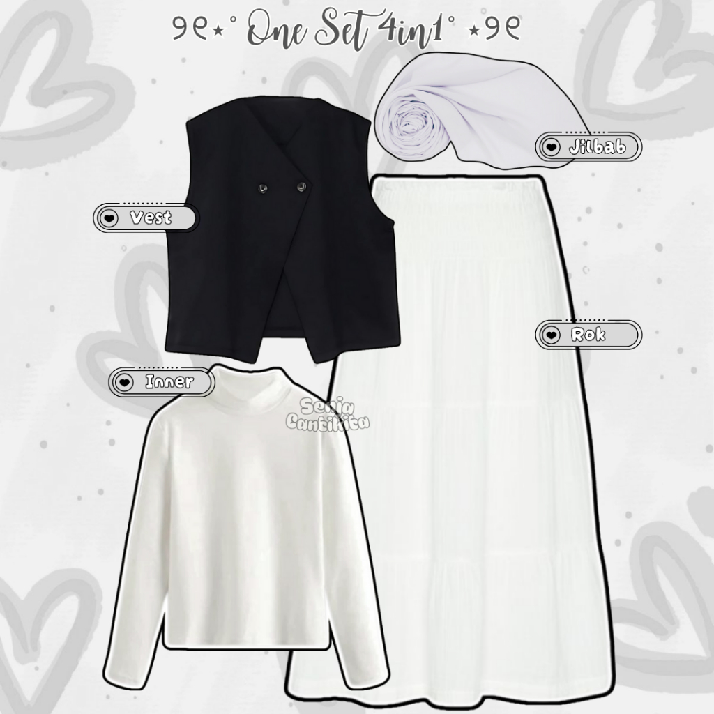 Setelan 4in1 Calm Muse (Alava Vest Hitam Inner Manset Putih Rok Polos A Line & Jilbab Silver)-SC069