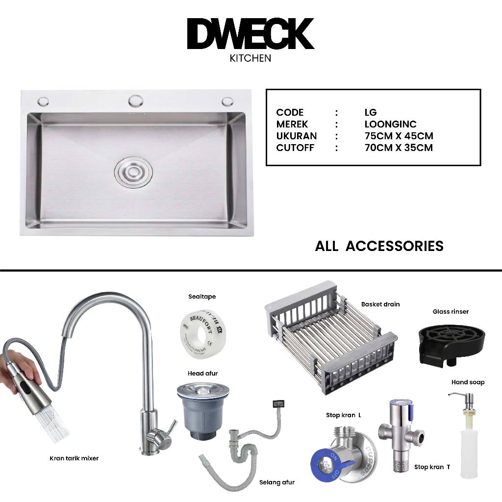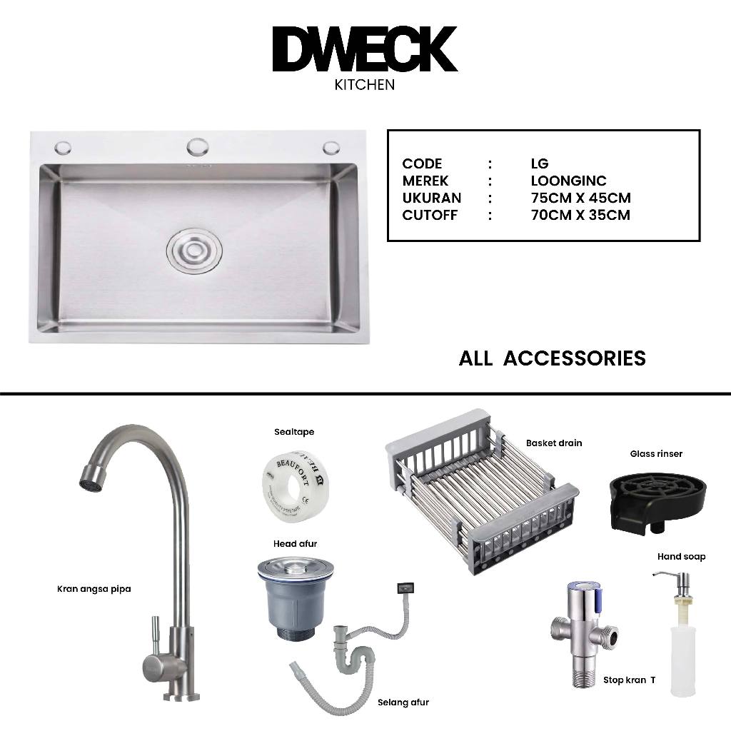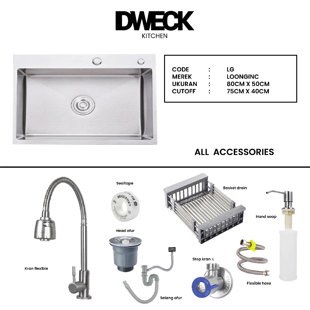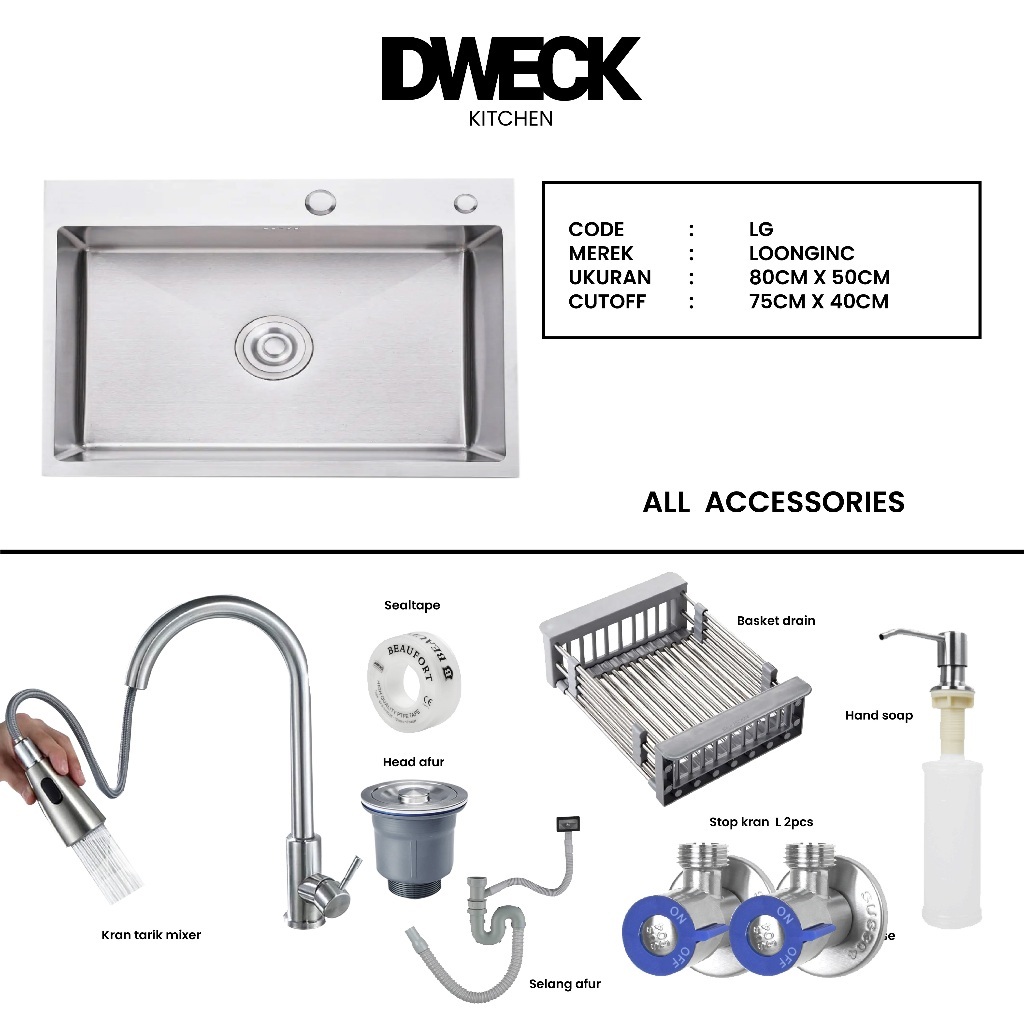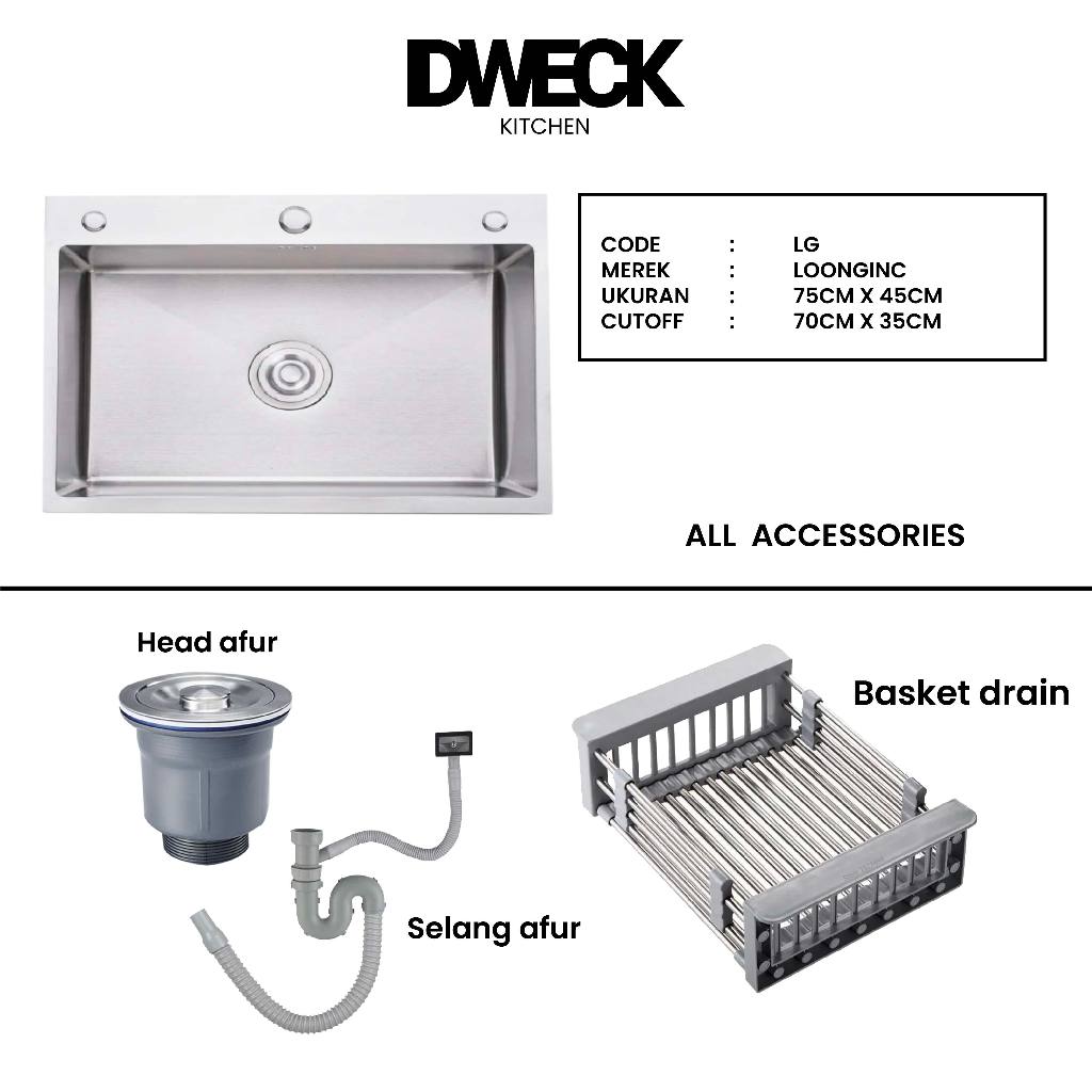 DWECK - Kitchen Sink Silver 1 Lubang Besar Stainless 304 Paket Komplit