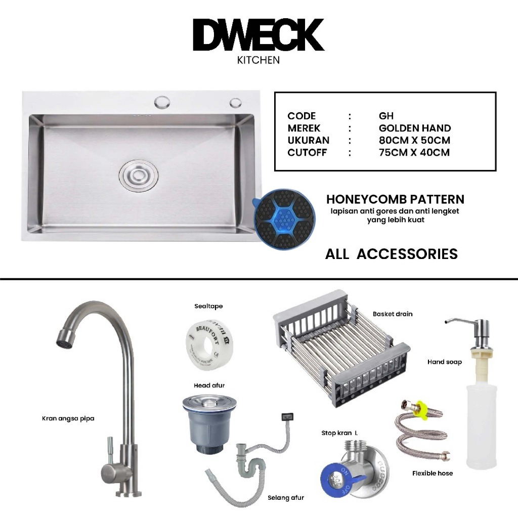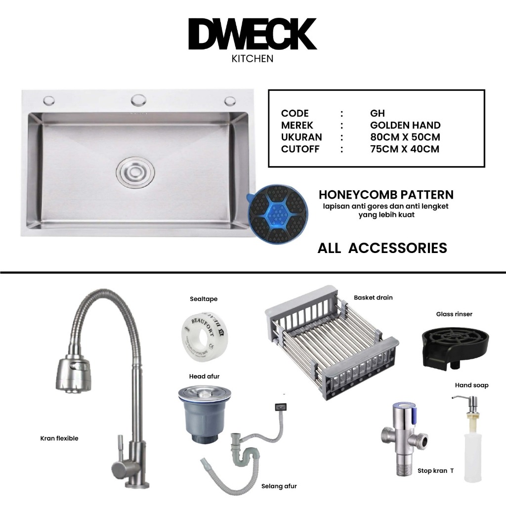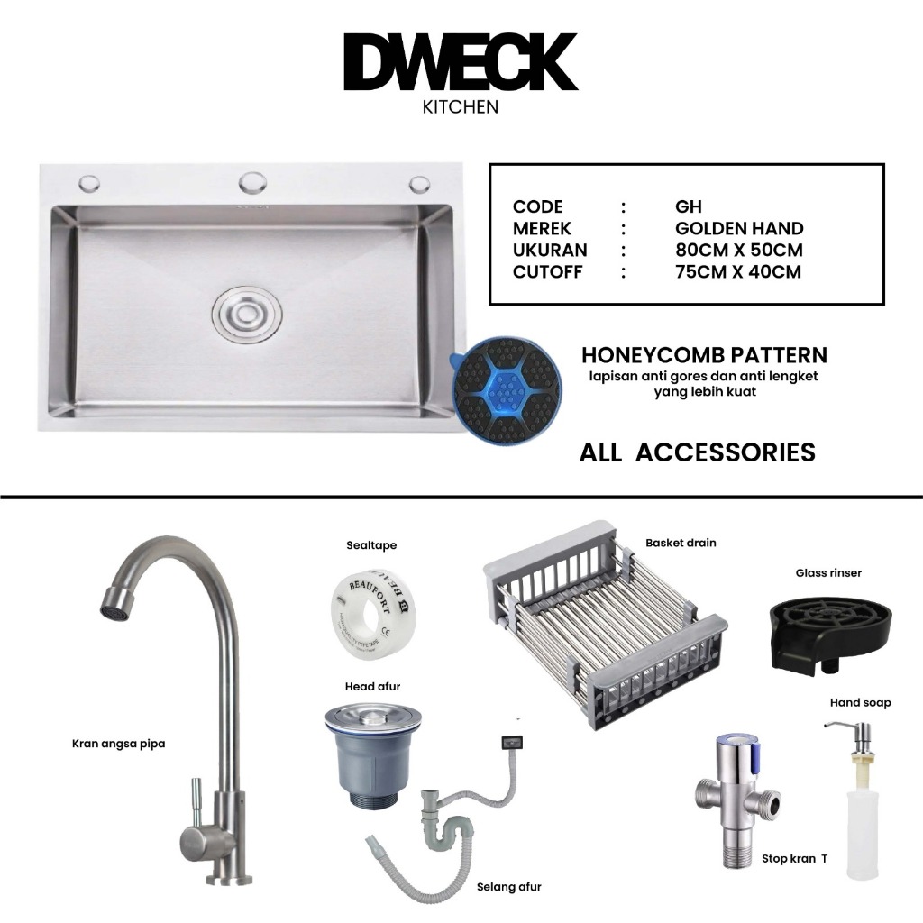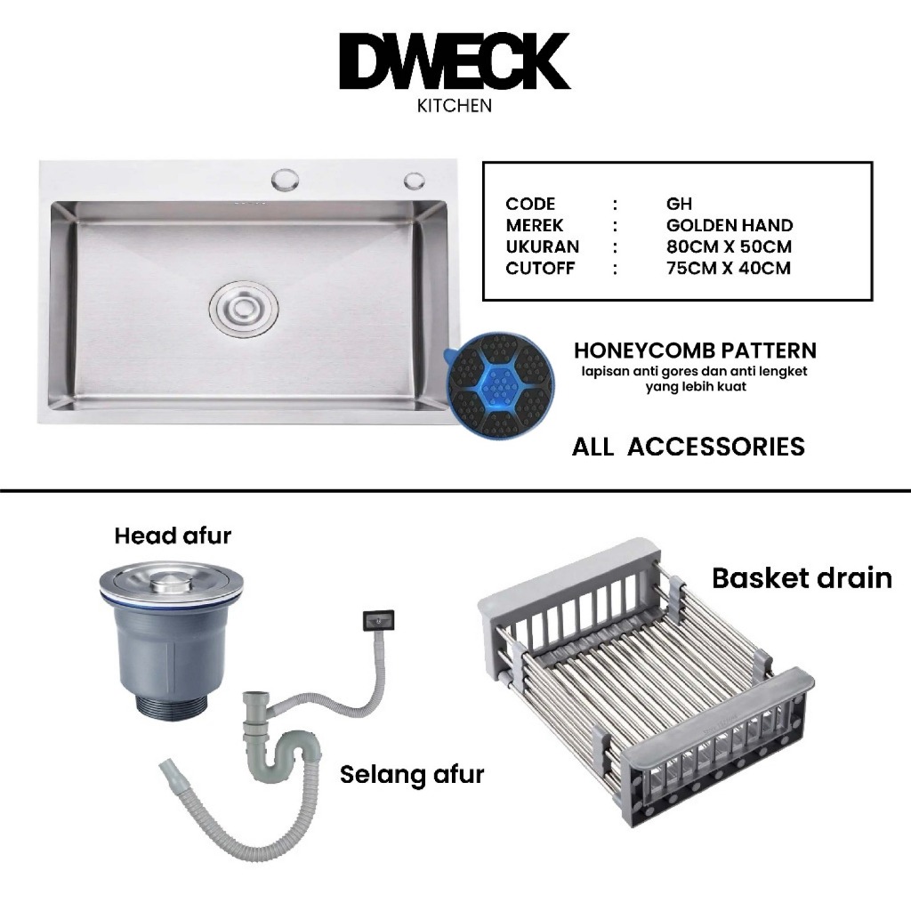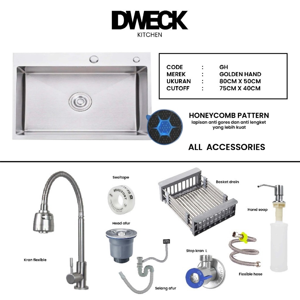 DWECK - Kitchen Sink Silver 1 Lubang Besar Stainless 304 Paket Komplit