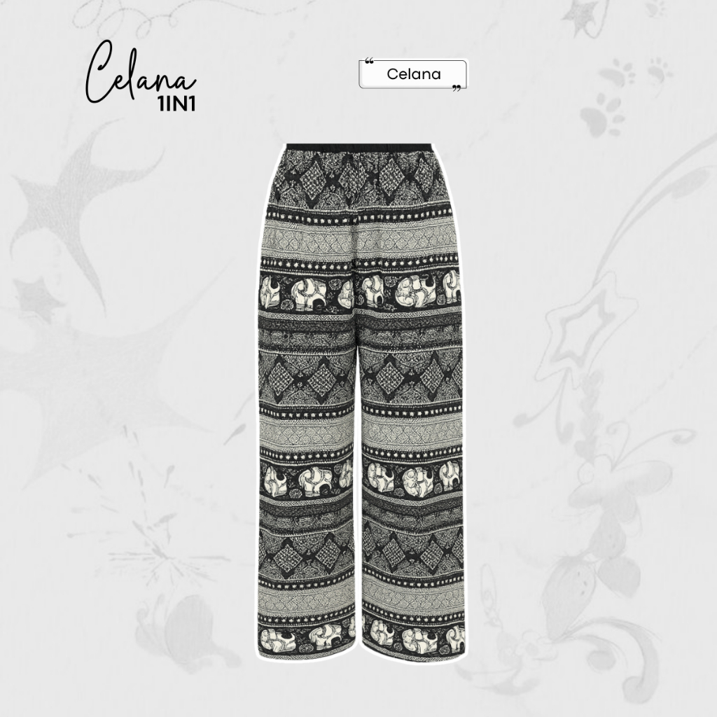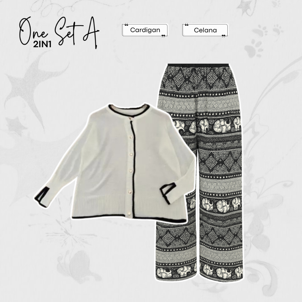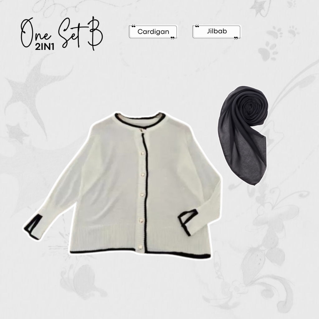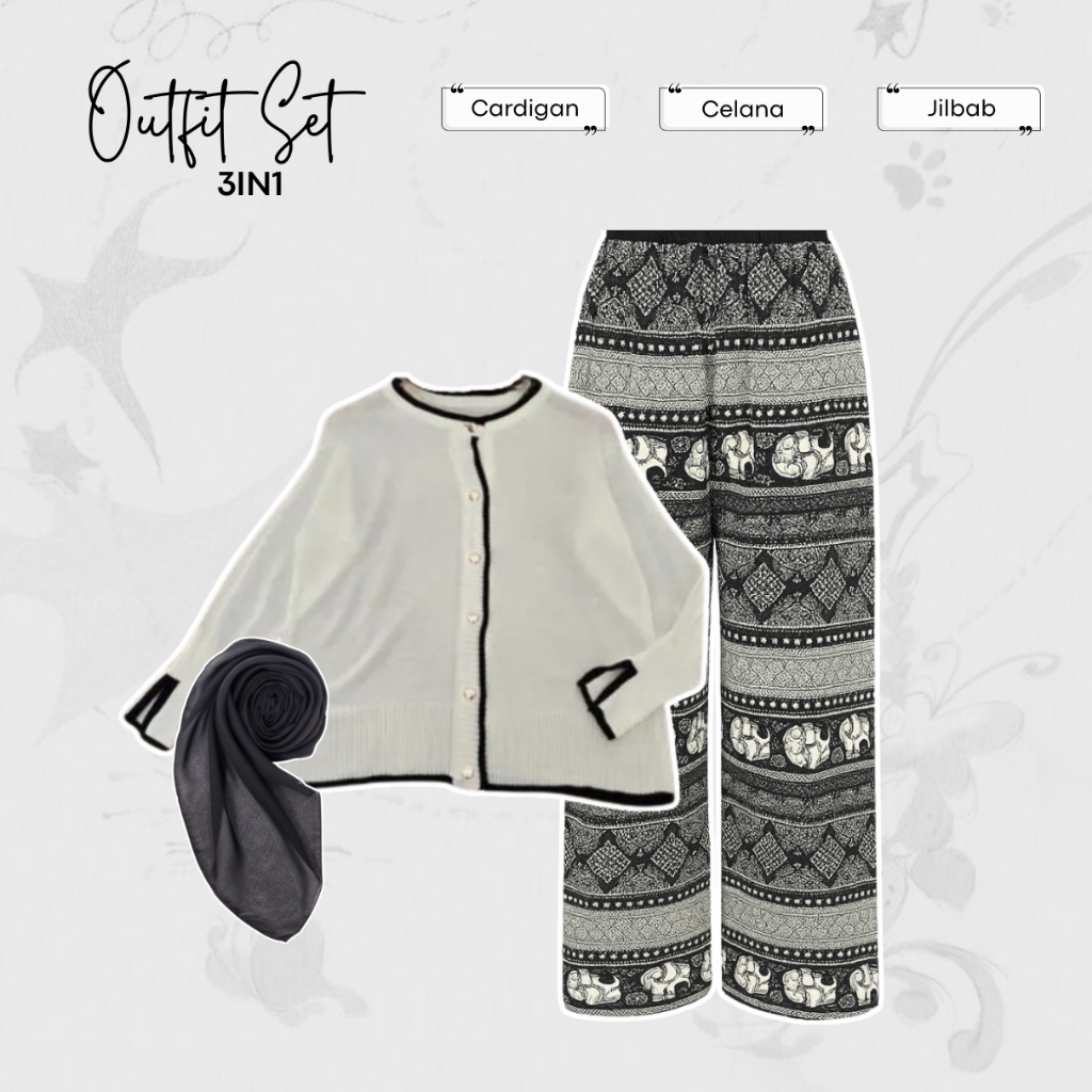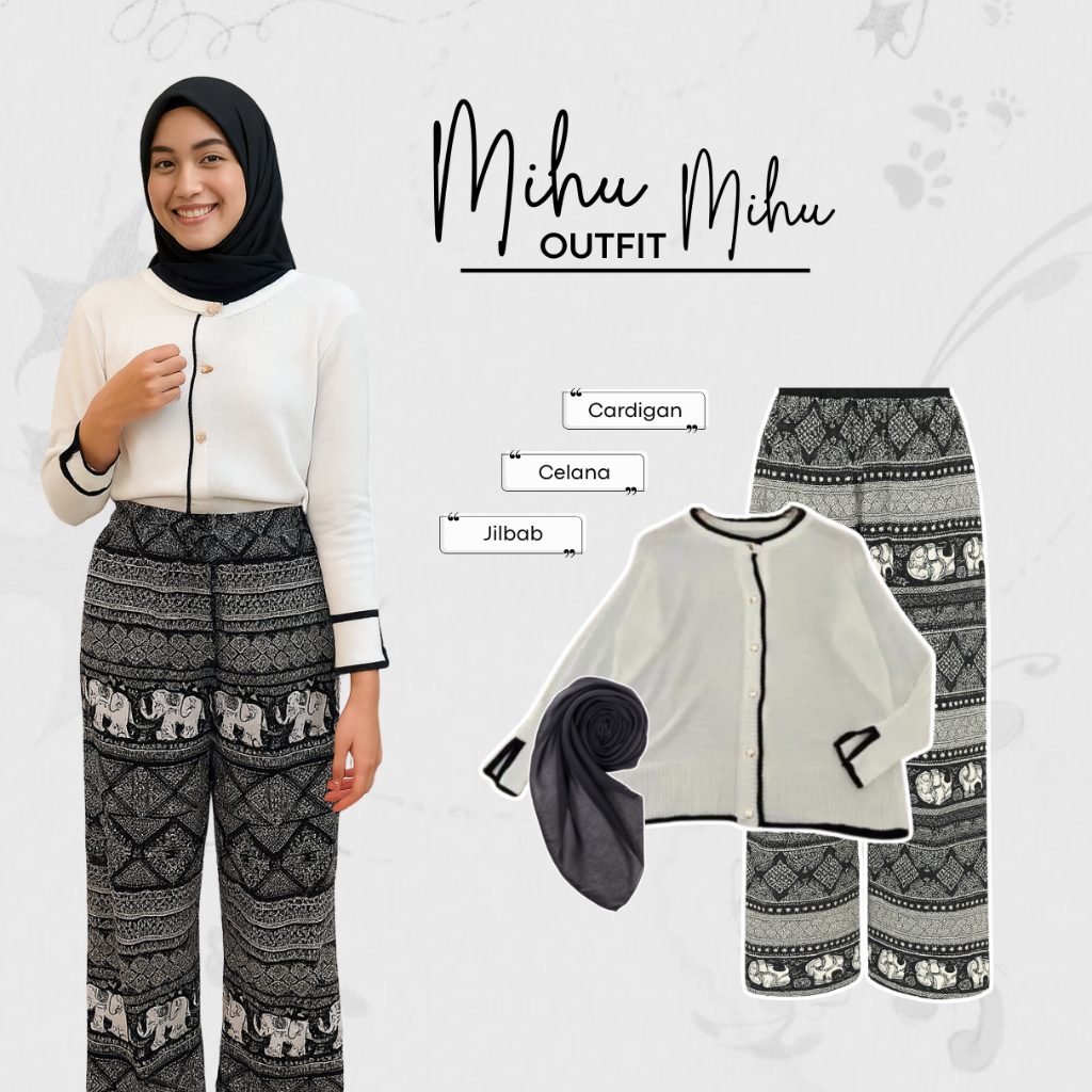 One Set Outfit Mihu Mihu (Cardigan Rajut, Celana Kulot Motif, Jilbab Bella Square) Daily - LW46