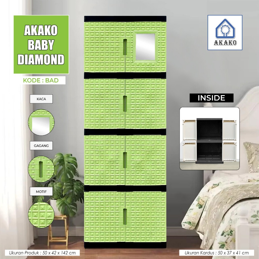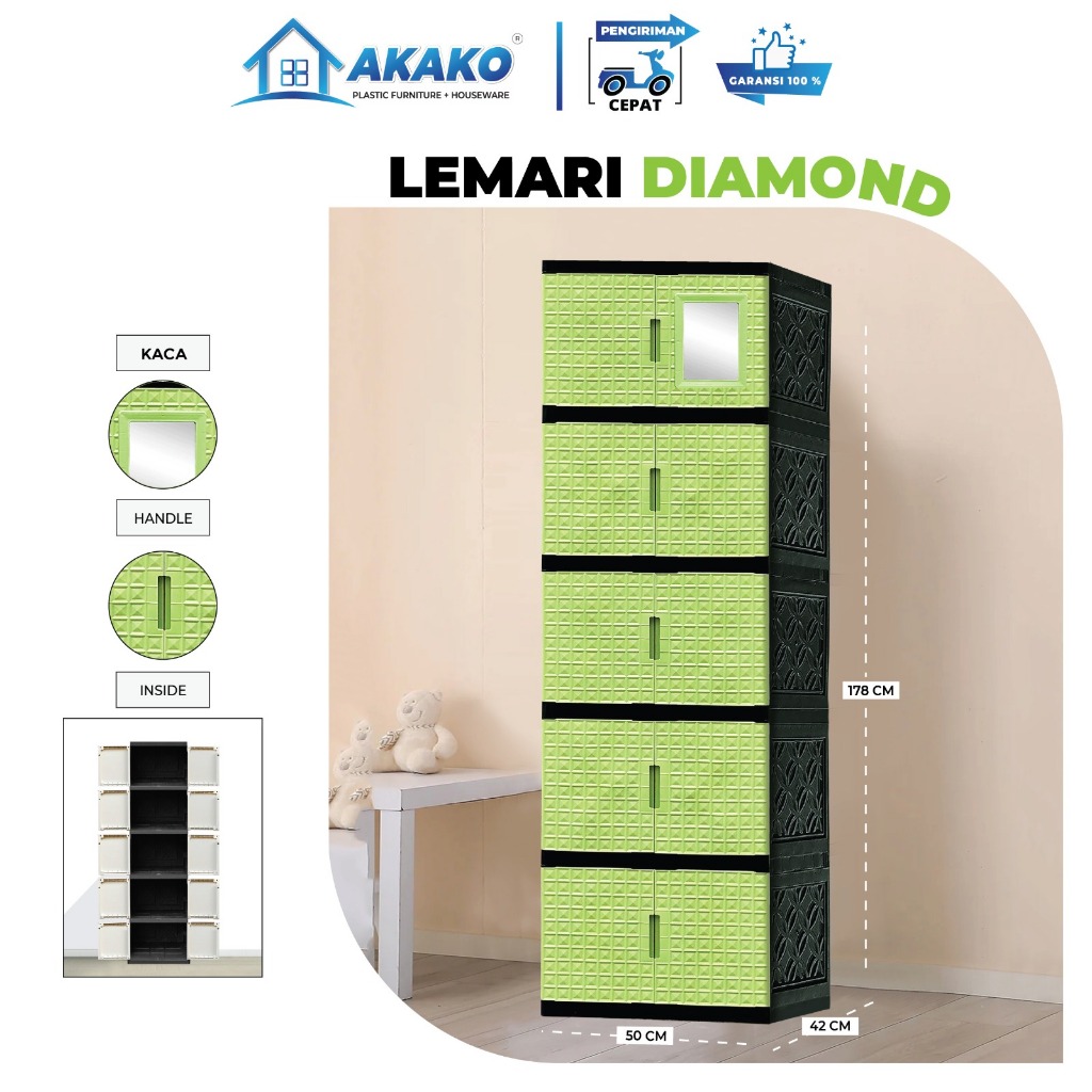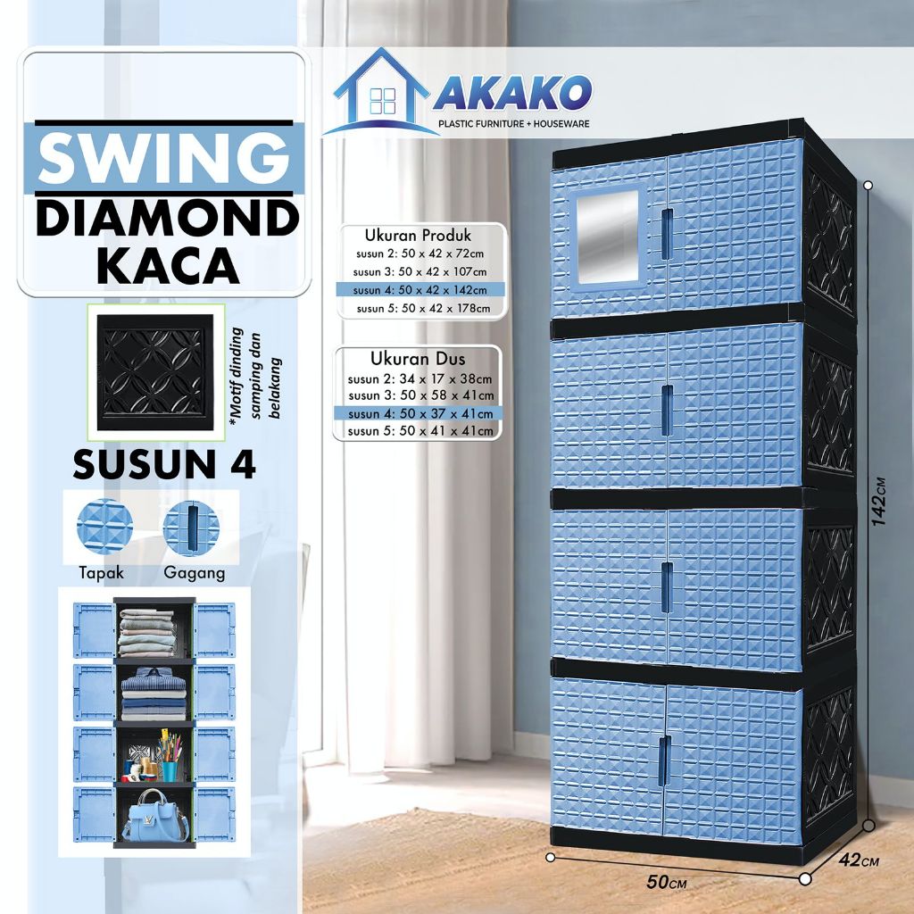 AKAKO - LEMARI PAKAIAN PLASTIK SWING DIAMOND SUSUN 4 DAN 5 PAKAI KACA
