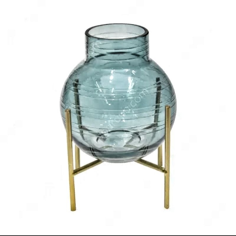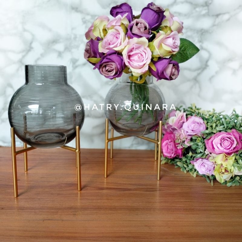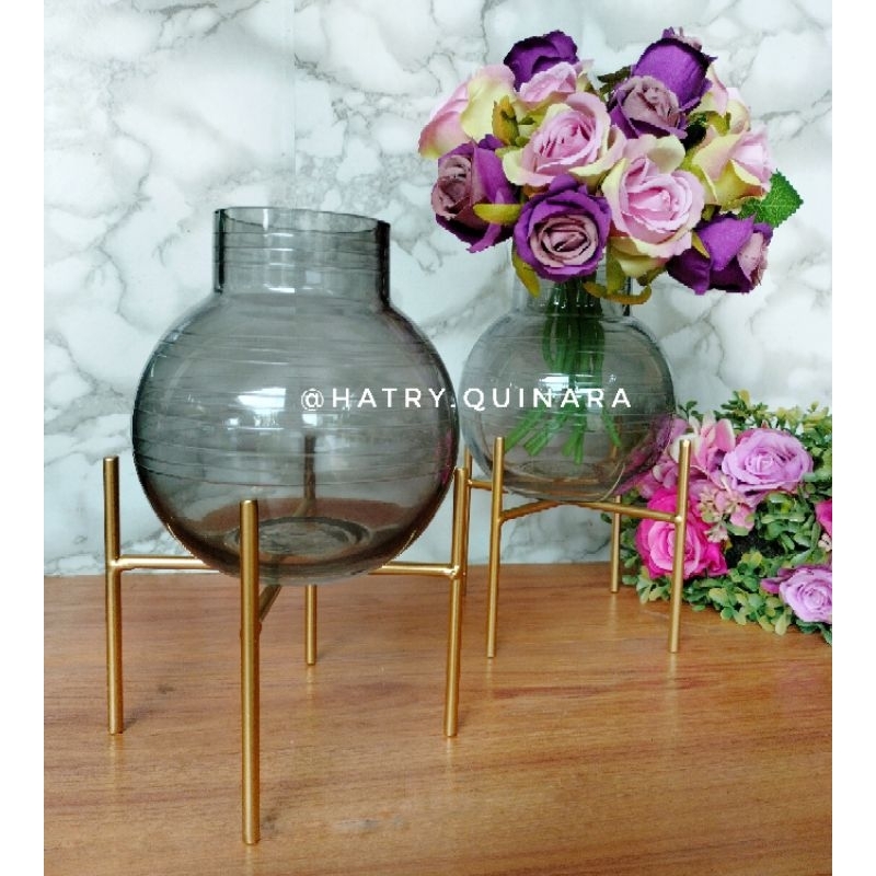 Vas kaca dengan penyangga metal gold,kaca hitam transparan