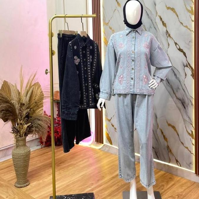 CILKIA ATASAN & SETELAN ROK/CELANA WANITA BORDIR KURUNG Baju Jeans Panjang Kulot Motif Casual Fit to XXL Material Premium Jeans Premium