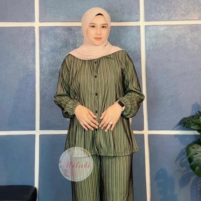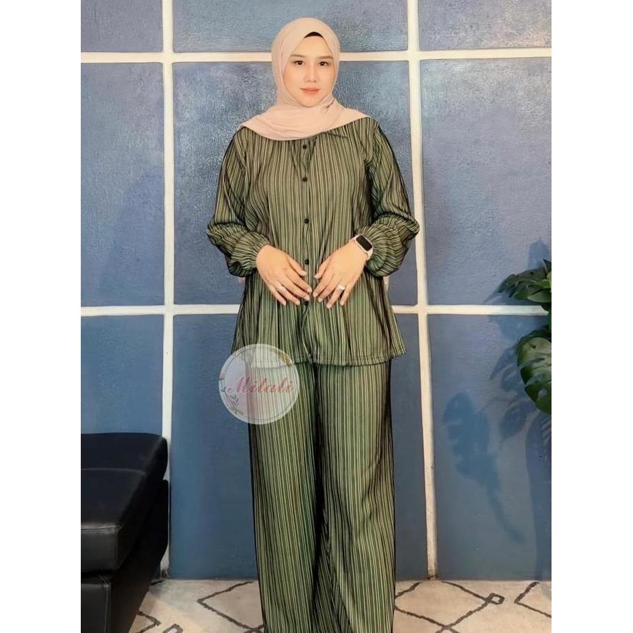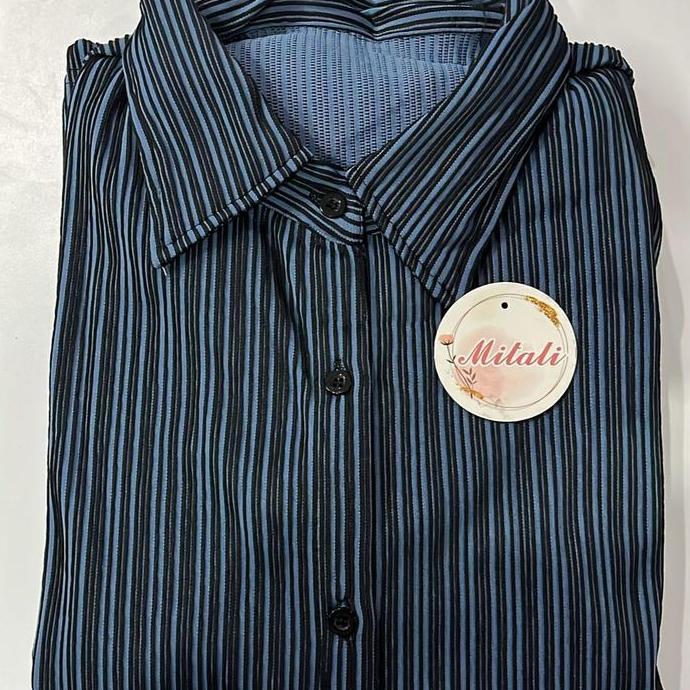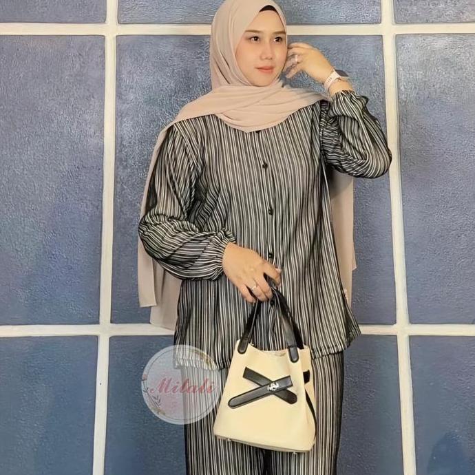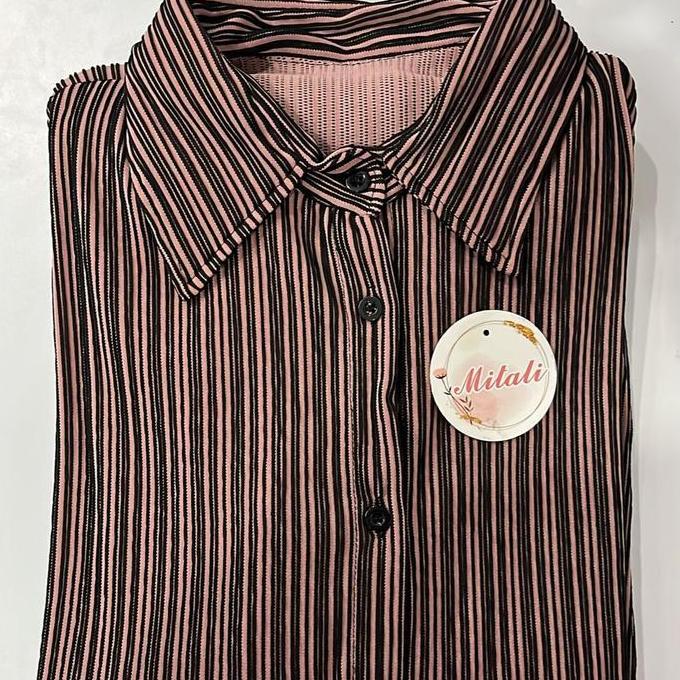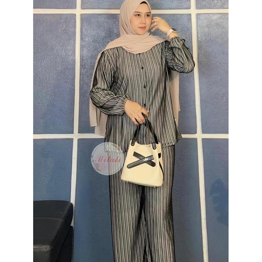MT - Oneset Salur Model kemeja Bahan Knit Salur Premium
