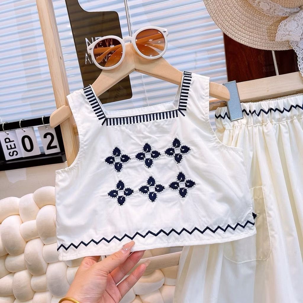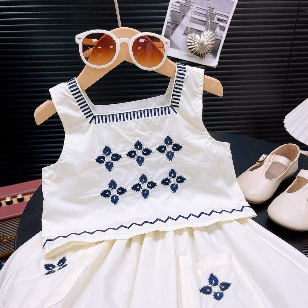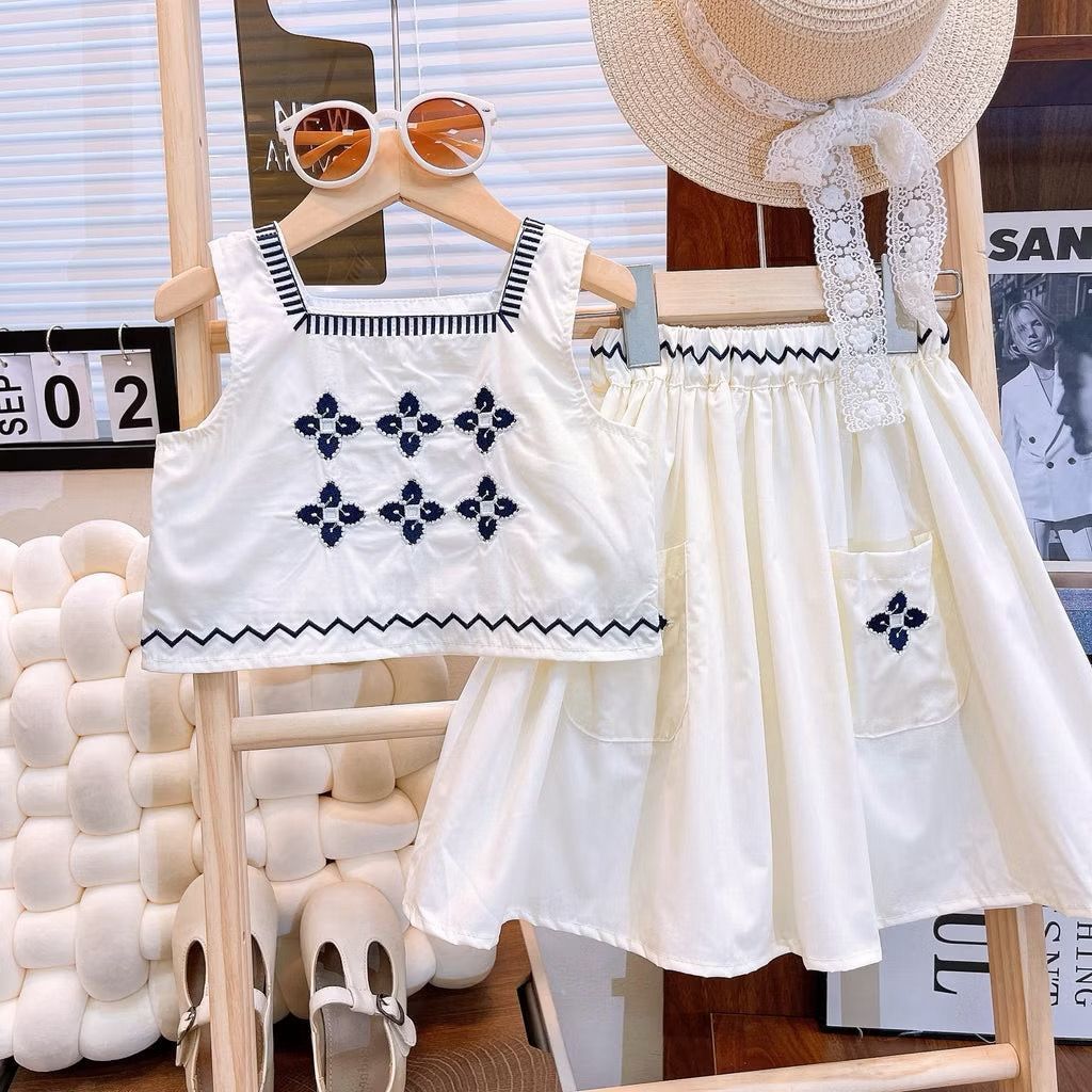 [FLASH SALE] MEI TI - Bloom Set -Setelan Rok Anak Import Perempuan Tanpa Lengan Crop Top Motif Wavy Leaf Bordir