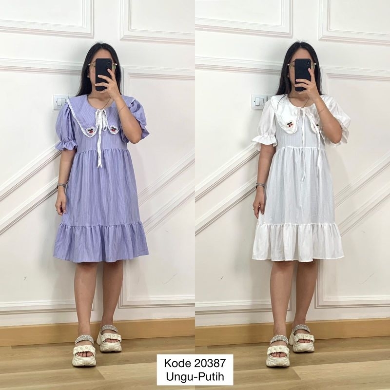 20387 Dress Bangkok Wanita Motif Cherry Kekinian Import Premium/ Dress BKK Polos Kerah V Rumple Korea Variasi Tali Pita Motif Cherry Bordir