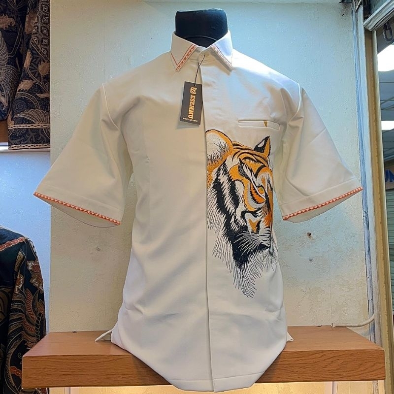 kemeja bordir manual,kemeja pria bordir warna putih motif macan