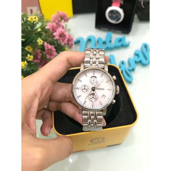 Jam Tangan F.OSSIL Boyfriend ES3382 Pearl Chronograph Silver Stainless Steel Original NWOT