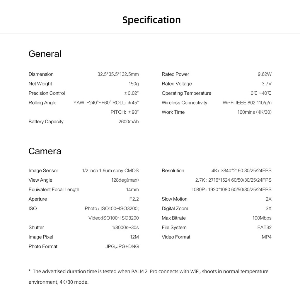 FIMI Palm 2 Pro 3-axis 4K 1/2" CMOS SENSOR GIMBAL POCKET CAM