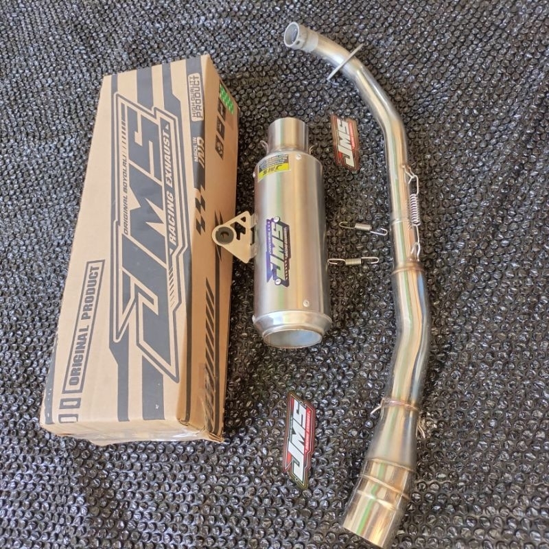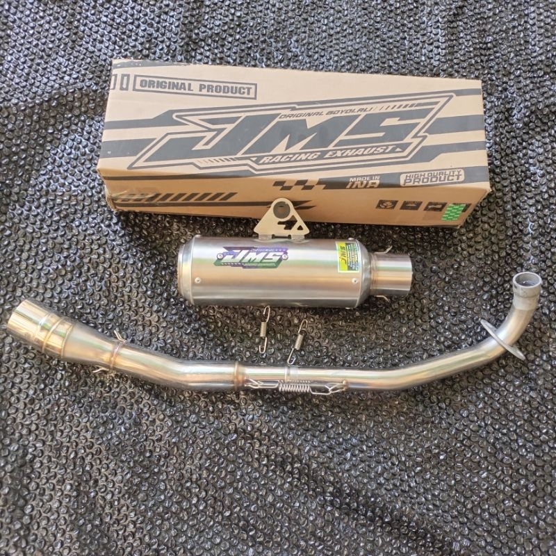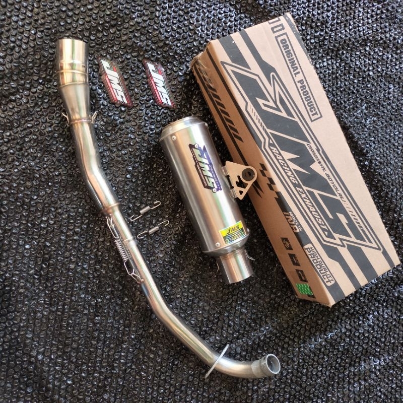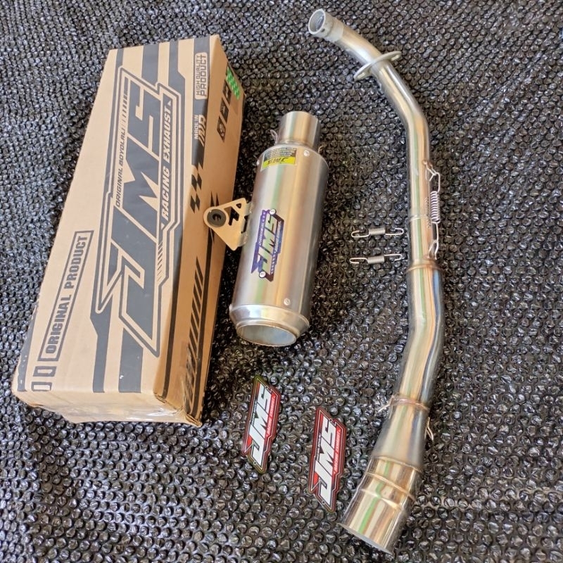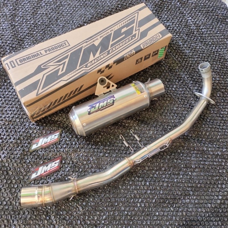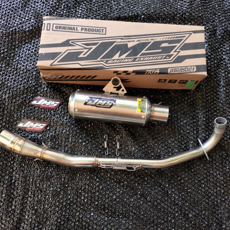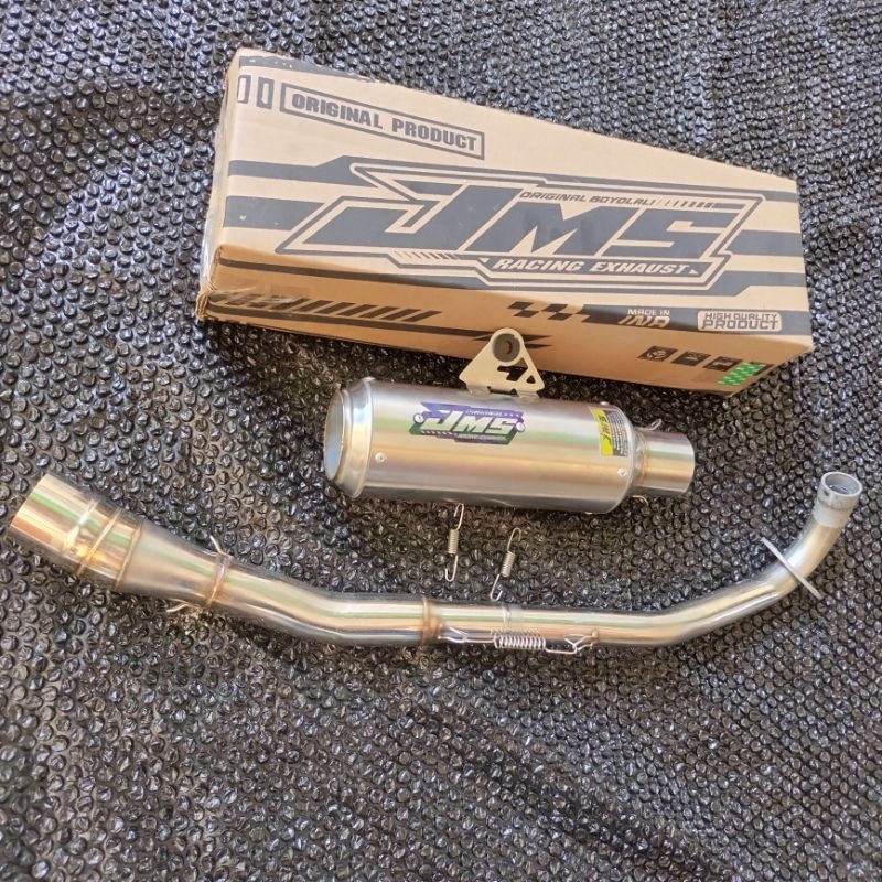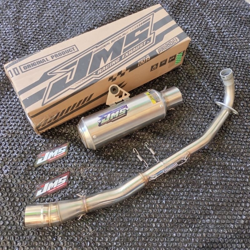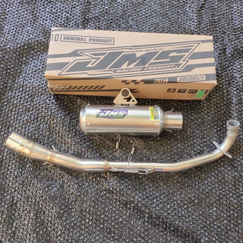 KNALPOT JMS ORIGINAL TYPE GP 1 FOR ALL MOTOR BEBEK LEHER NETRAL SAMPING BONUS KARDUS PAKING EMBLEM BLUE TITANIUM.