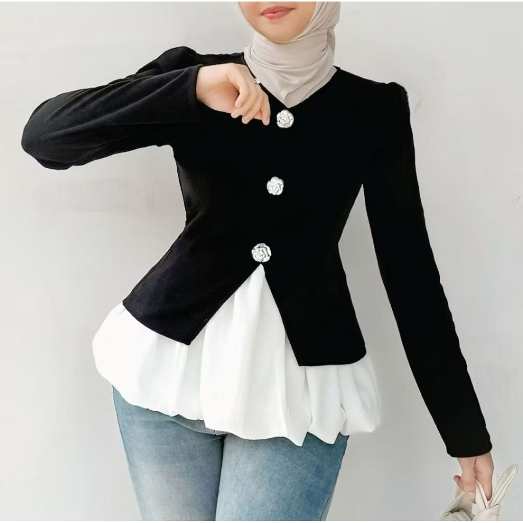 BAJU SUZY BALOON KNIT TOP BLOUSE BUSUI FRIENDLY | BAJU ATASAN WANITA KNIT TEBAL KANCING BUNGA MELATIC TANGAN PANJANG CEWEK DEWASA CASUAL KNITWEAR BELAKANG RESLETING