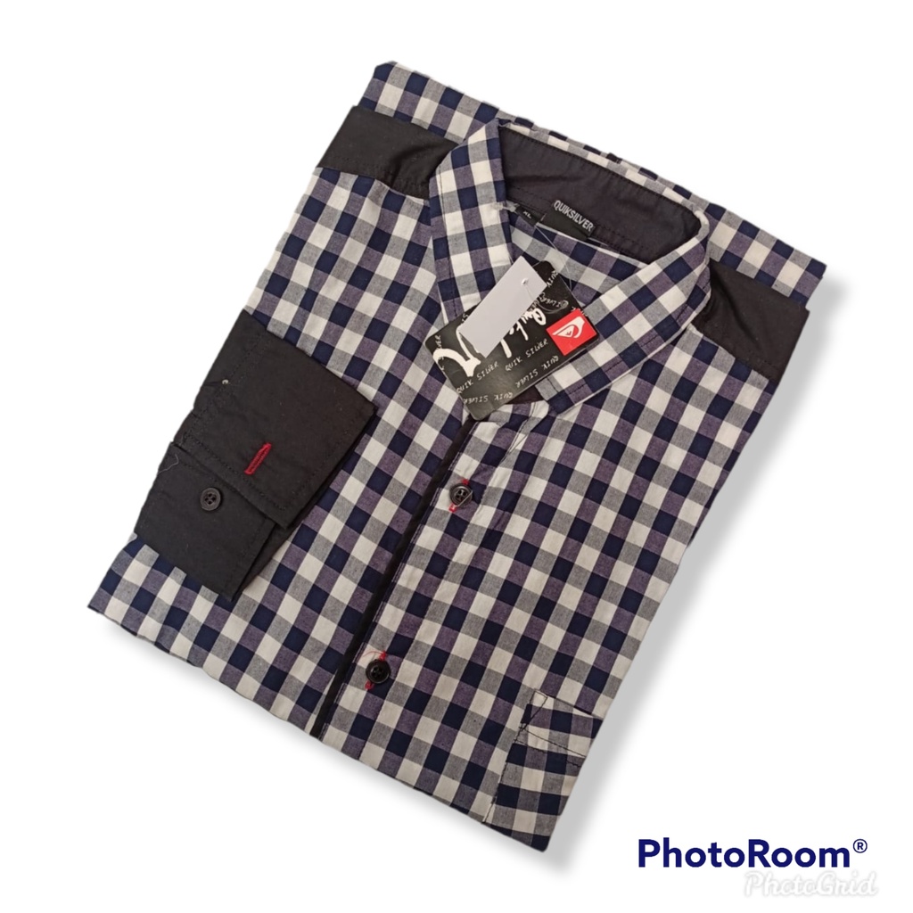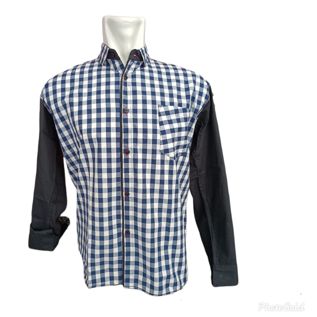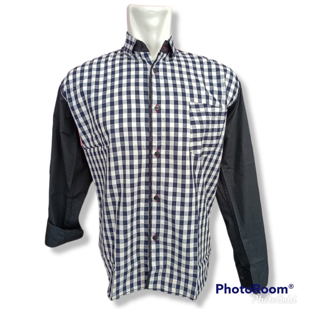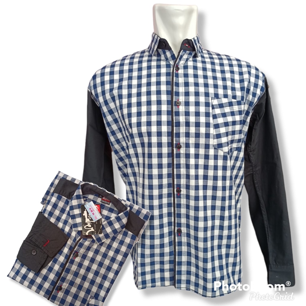 Baju Kemeja Hem Panjang Kombinasi Kotak dan Lengan dan Belakang warna Polos Katun Shirt Premium Distro Pria Remaja Dewasa Santai Nyaman Kantoran Ukuran XL