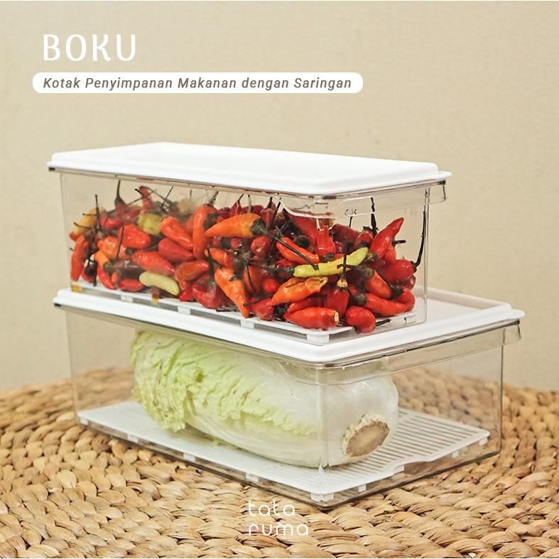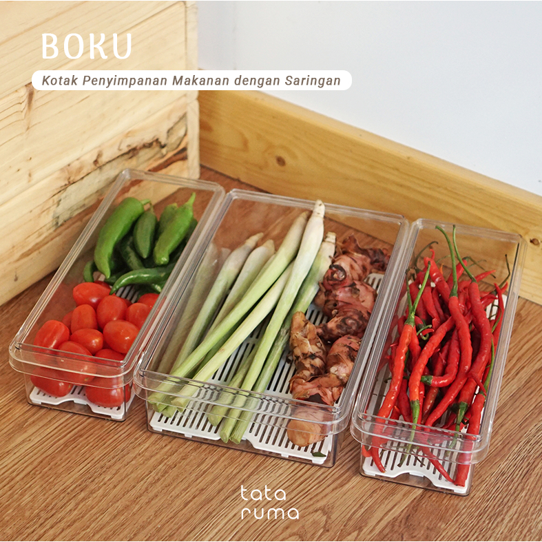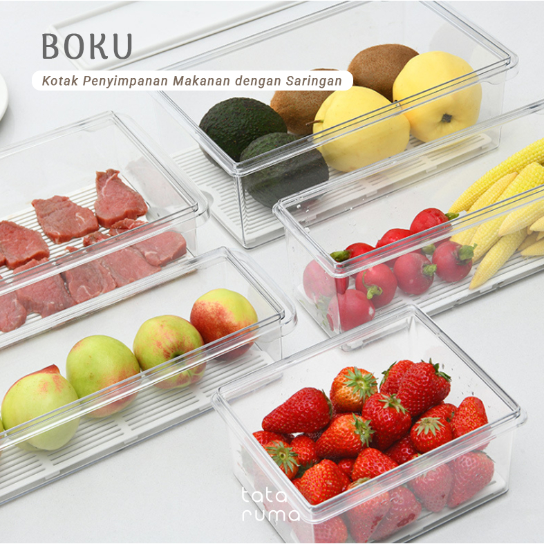 TATARUMA Boku - Kotak Kontainer Tempat Penyimpanan Toples Makanan Sayur Buah Daging Bawang Cabai Kulkas Fridge Freezer Food Storage Container Organizer Box Dengan Saringan Strainer