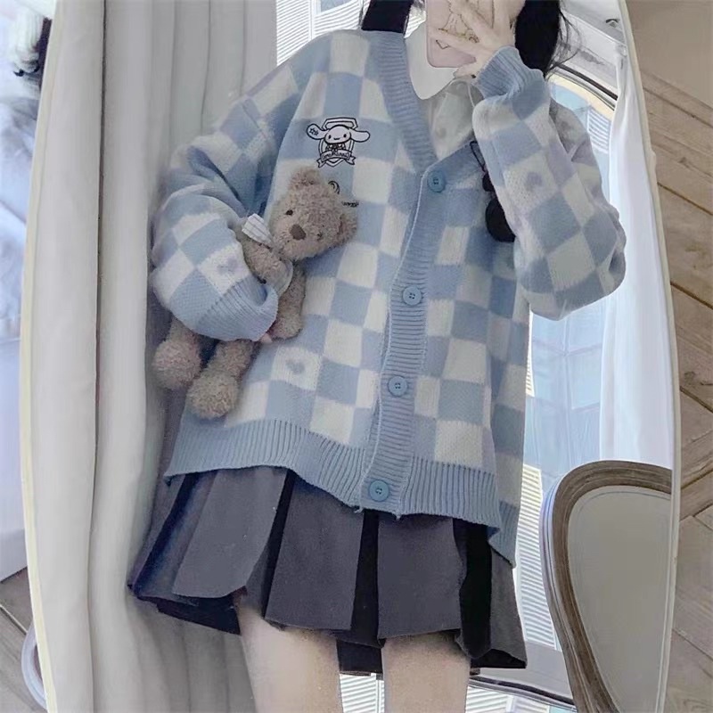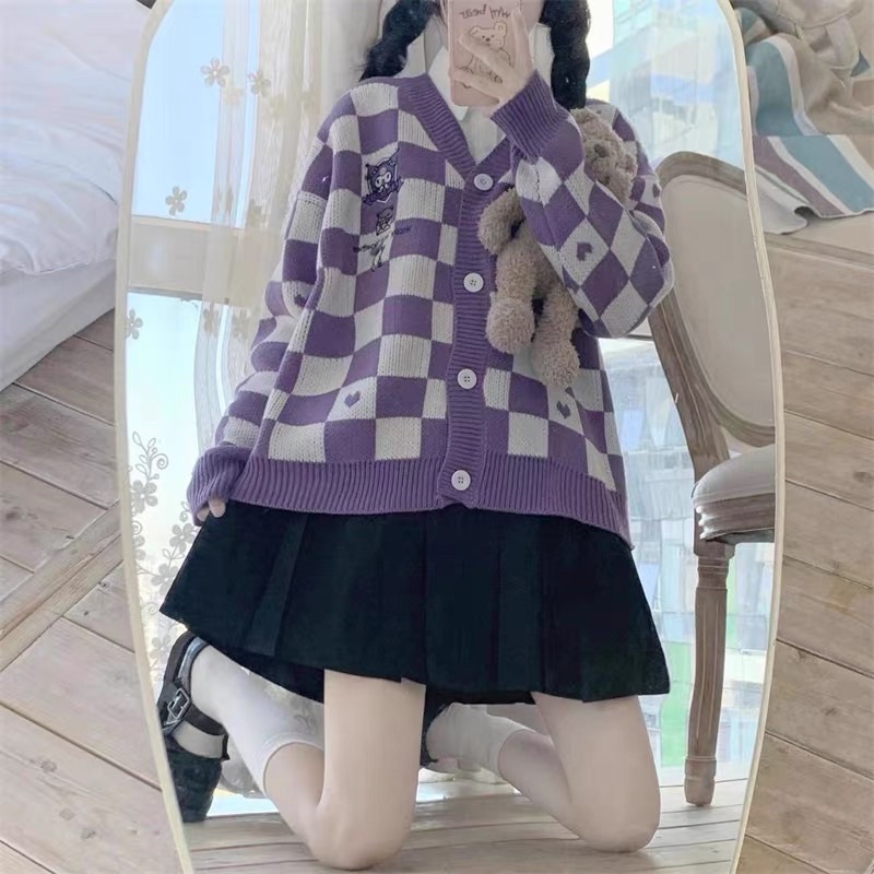 [READY STOCK] SANRIO FRIENDS CARDIGAN my melody kuromi pompompurin cinnamoroll kardigan oversized lolita jepang gaya lucu wanita korea gingham motif kotak-kotak hati