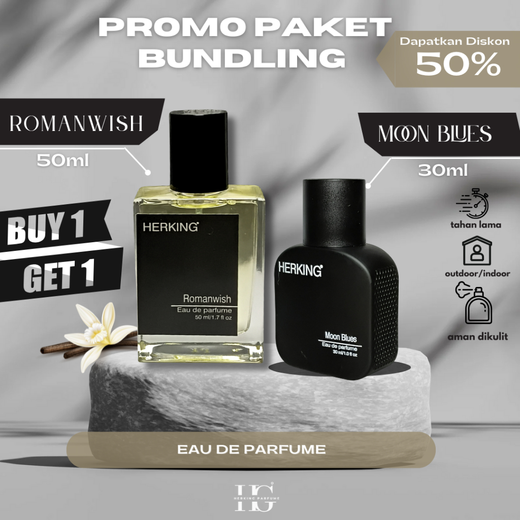 (PAKET BUNDLING) PARFUM HERKING PRIA WANITA BUY 1 GET 1 PARFUM ROMANWISH & MOON BLUES TAHAN LAMA TERLARIS & TERMURAH