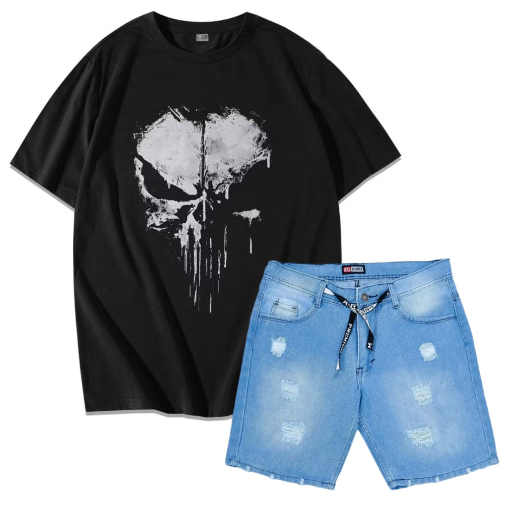 SETELAN JEANS PENDEK SOBEK DAN KAOS DISTRO PUNISHER BAHAN DENIM KAOS COMBATH 24S ADEM HALUS