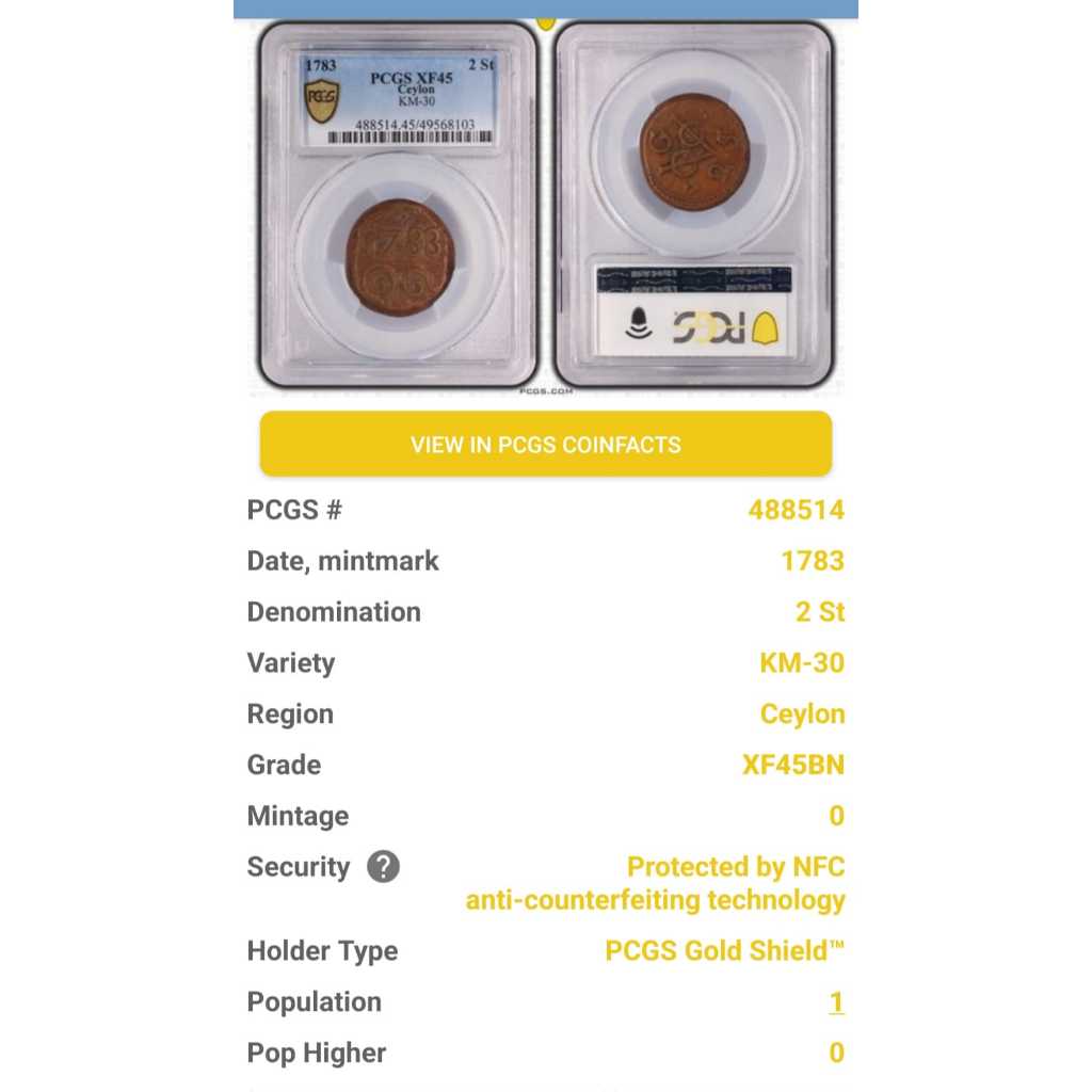 Koin Kuno Sri lanka Ceylon 2 Stuiver VOC 1783 PCGS XF45 BN - TOP POP
