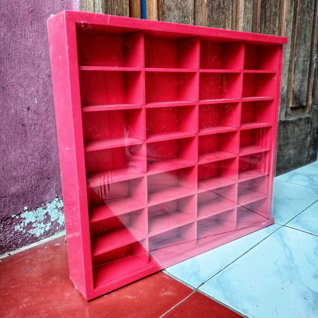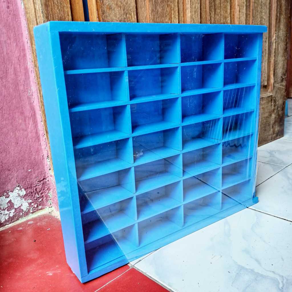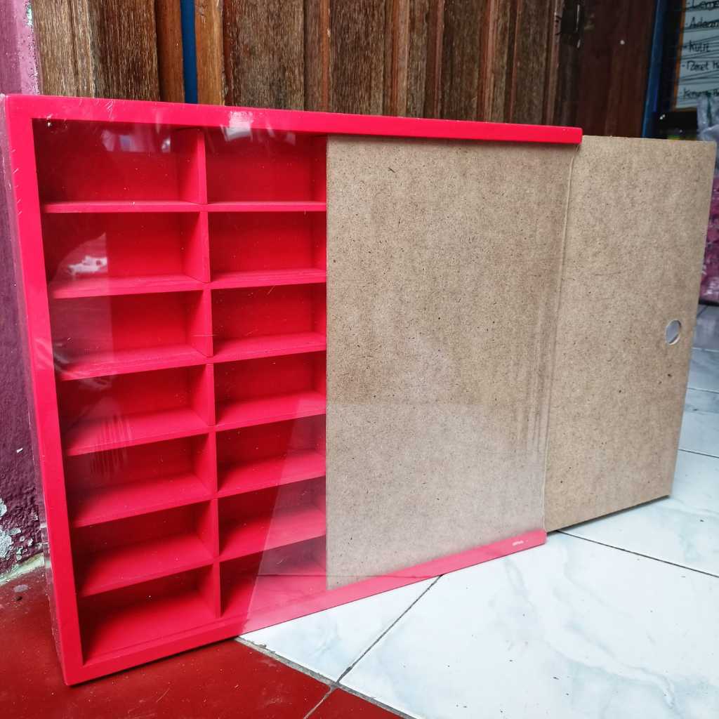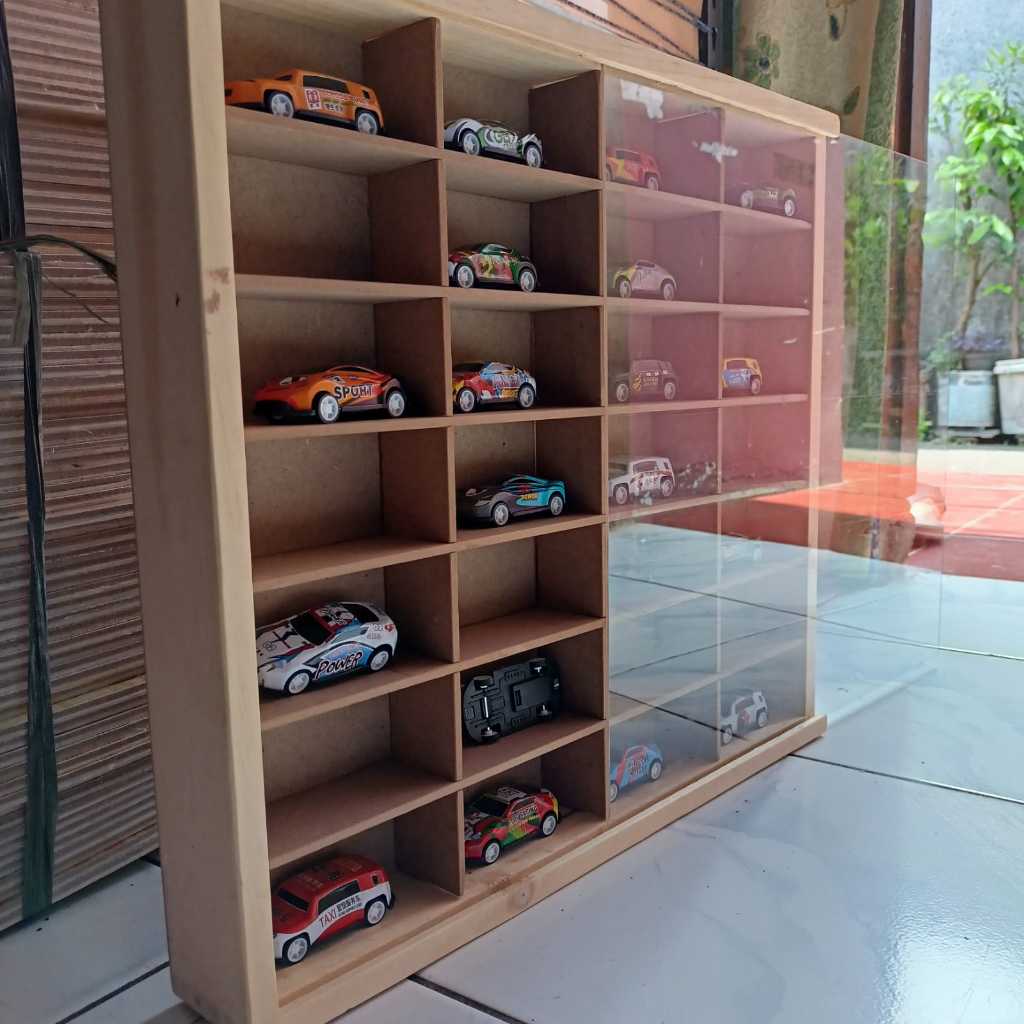 Rak Hot Wheels Isi 28 Slot 1:64 Bahan Kayu Dilengkapi Penutup MDF/Akrilik Bisa Gantung Rak Gantung