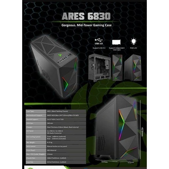 Case Casing PC Gamemax ARES 6830 Gaming Mid Tower Case-RGB