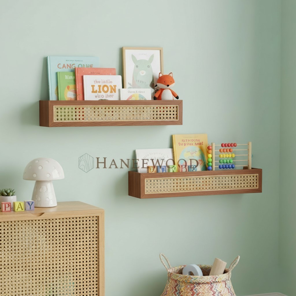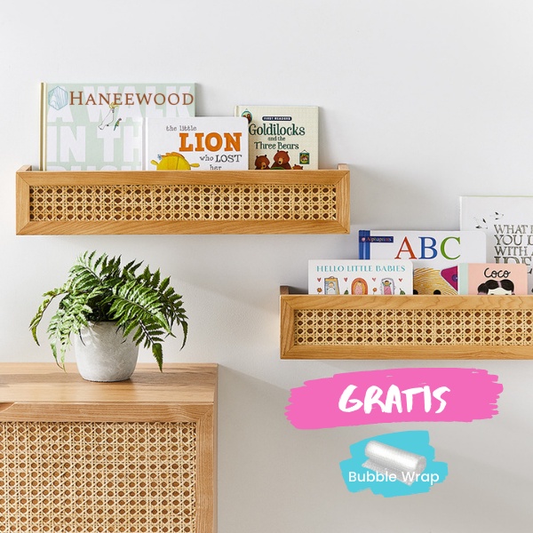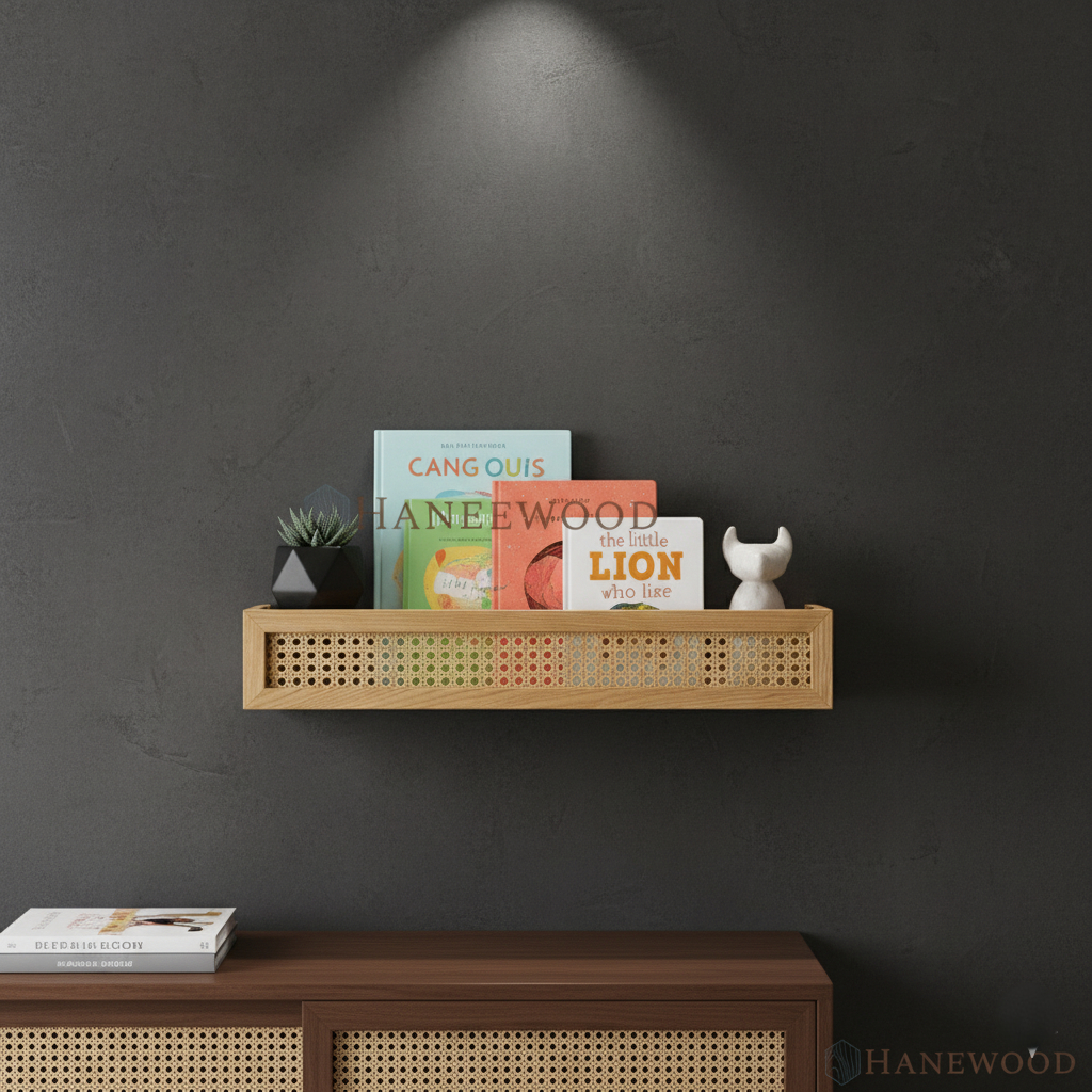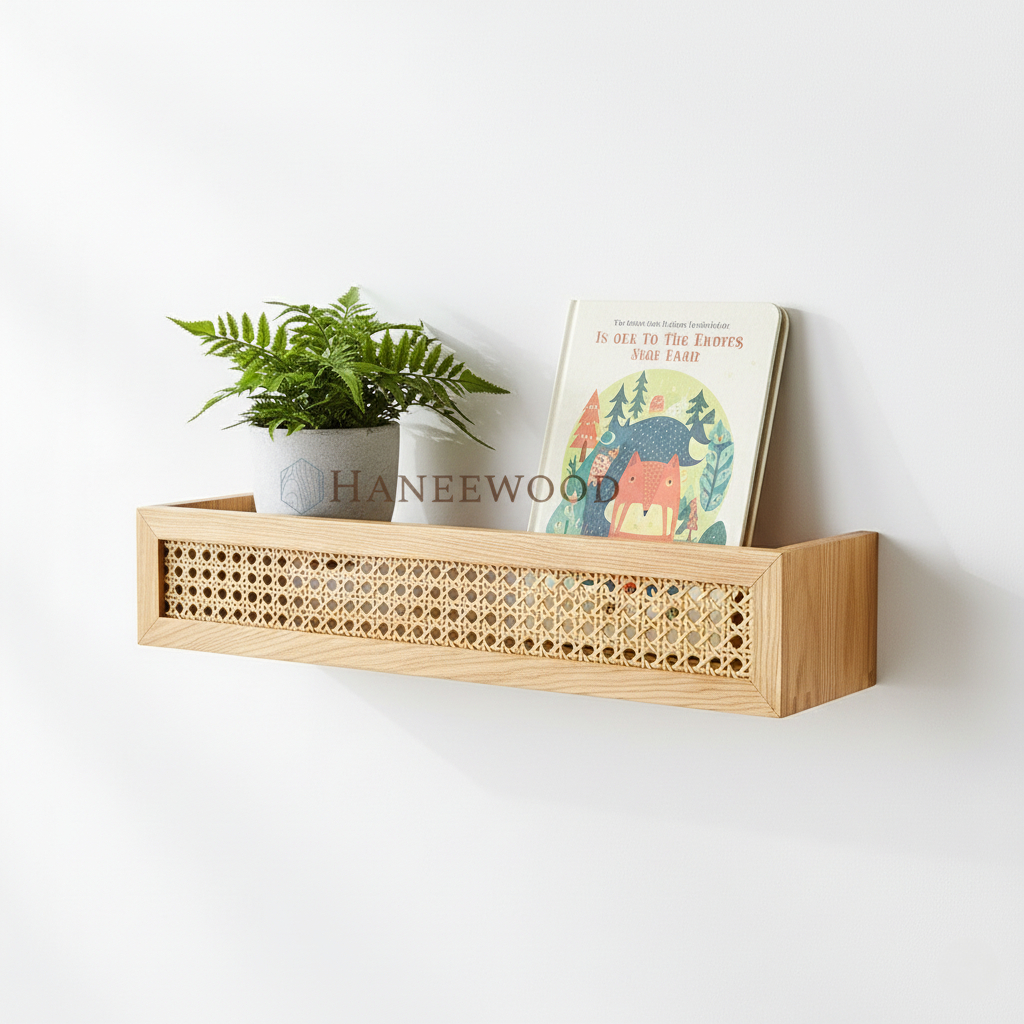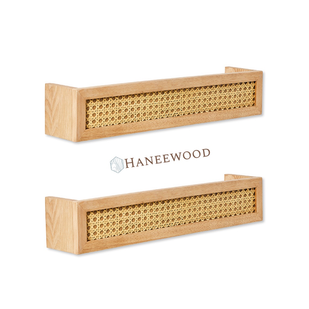 Rak Dinding Rotan Webbing | Rak Buku Aesthetic Korea | Ambalan Kayu Japandi Hiasan Dinding HaneeWood