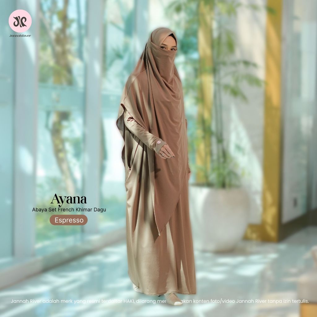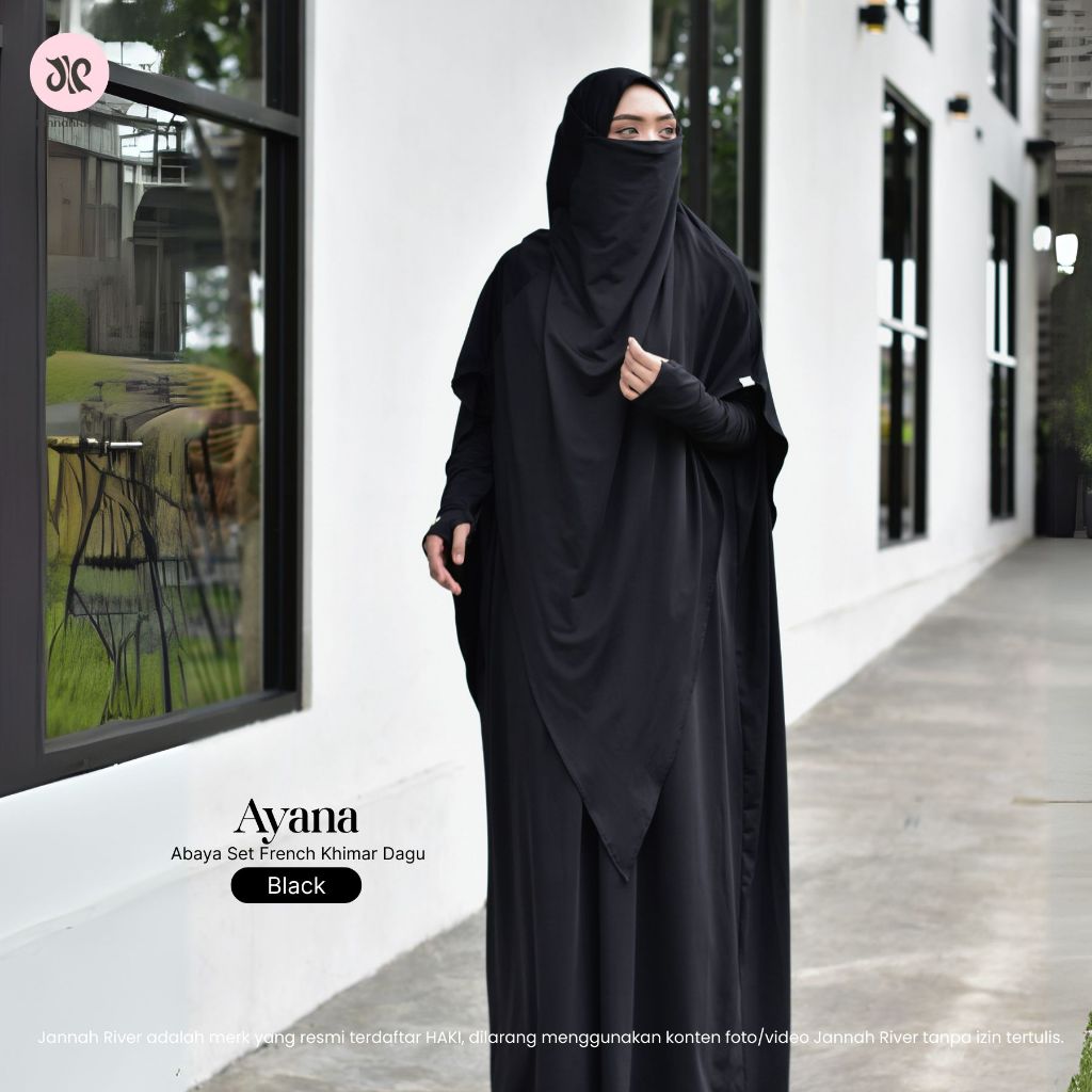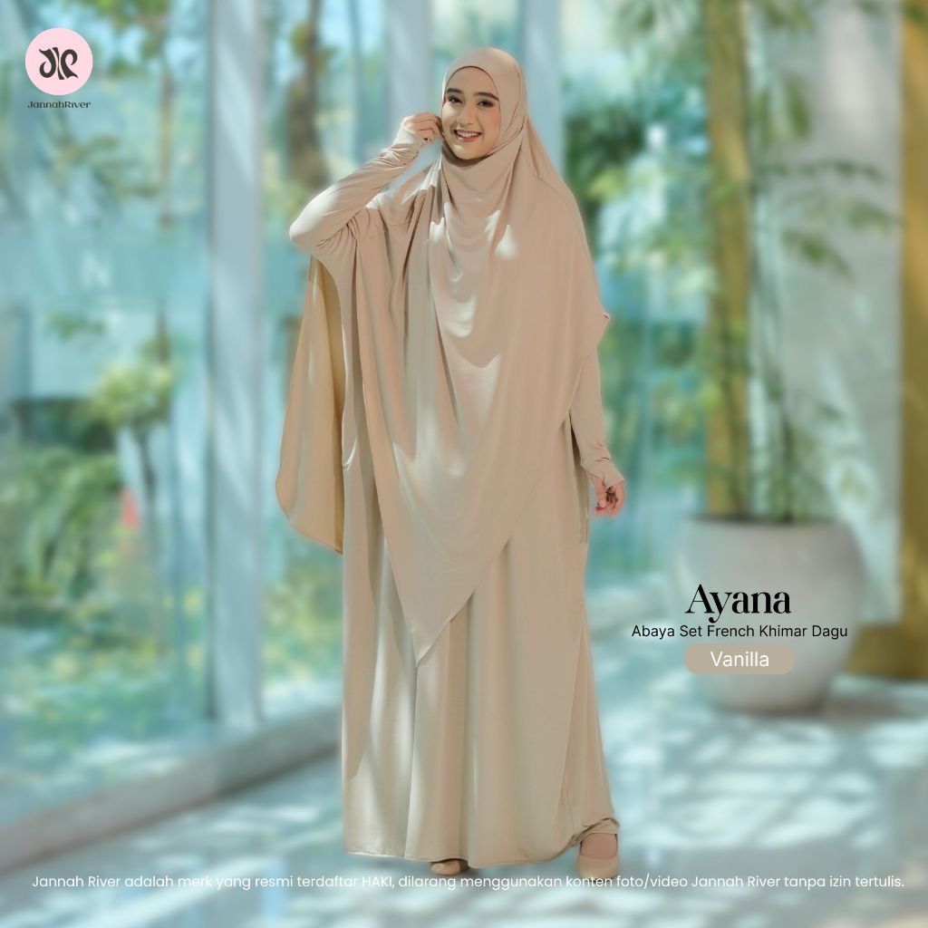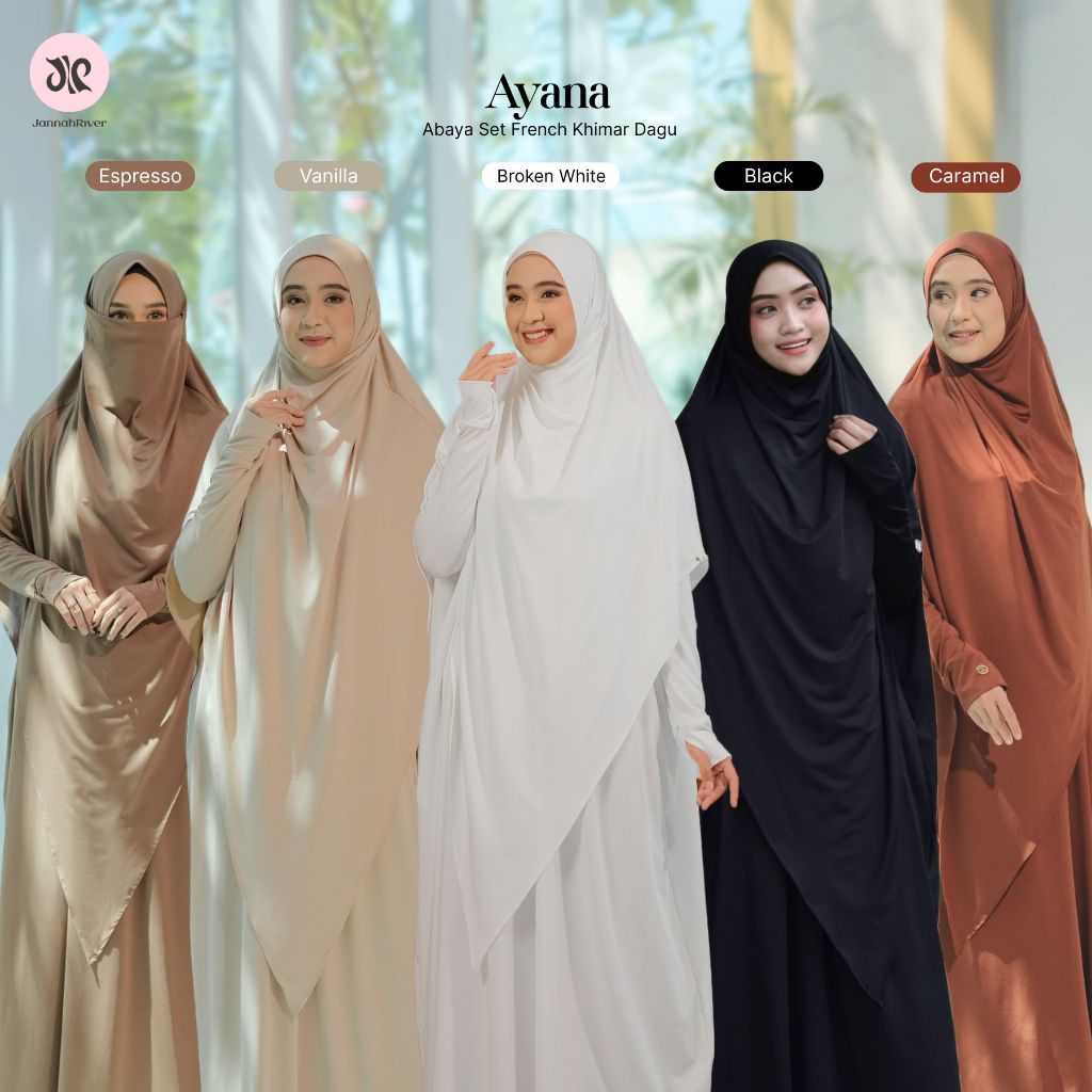 Jannah River Abaya Ayana Set French Khimar Dagu Syari Bahan Jersey Korea Premium Adem Gamis Seragam Haji & Umroh