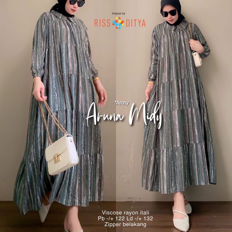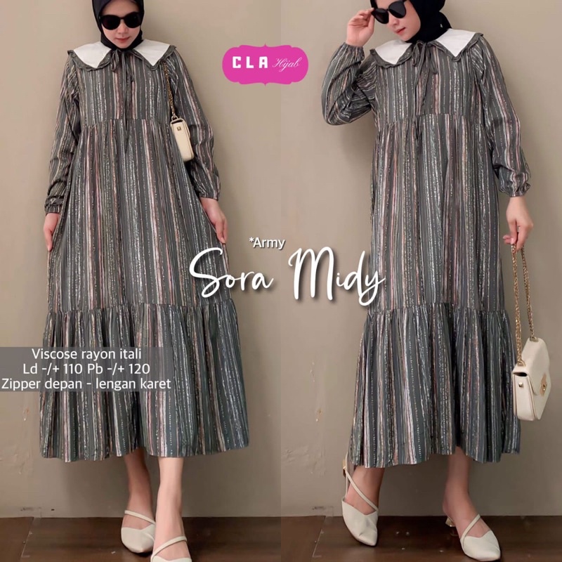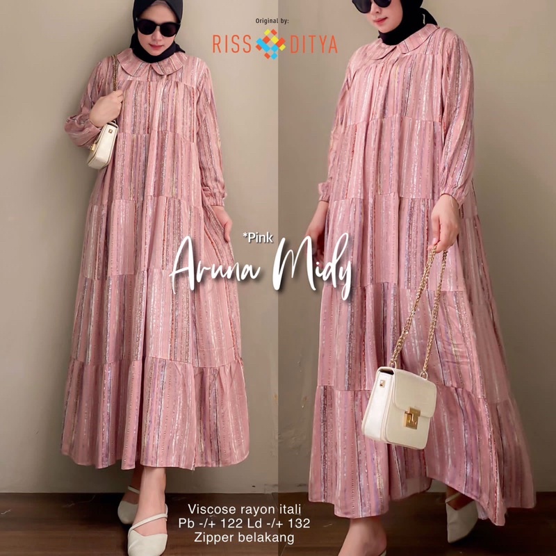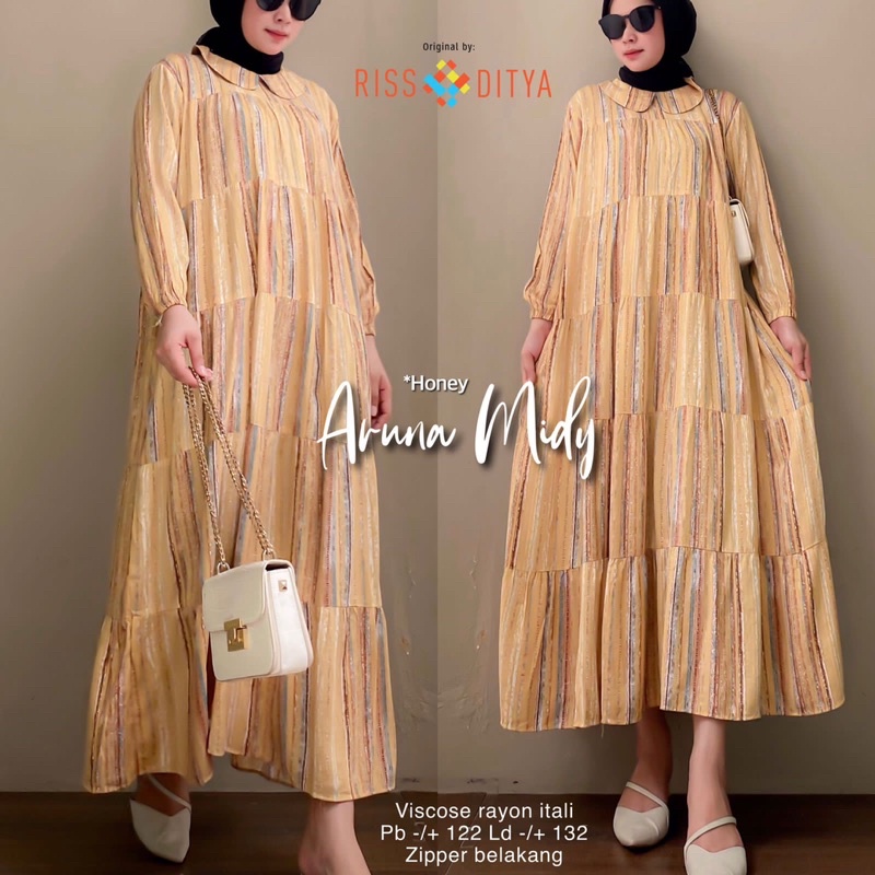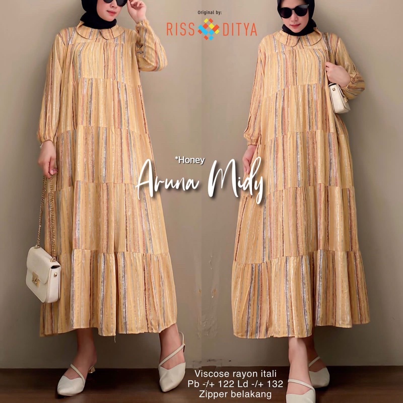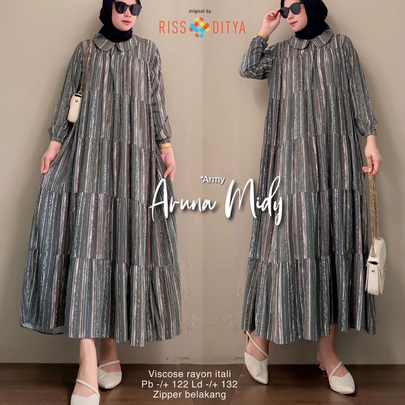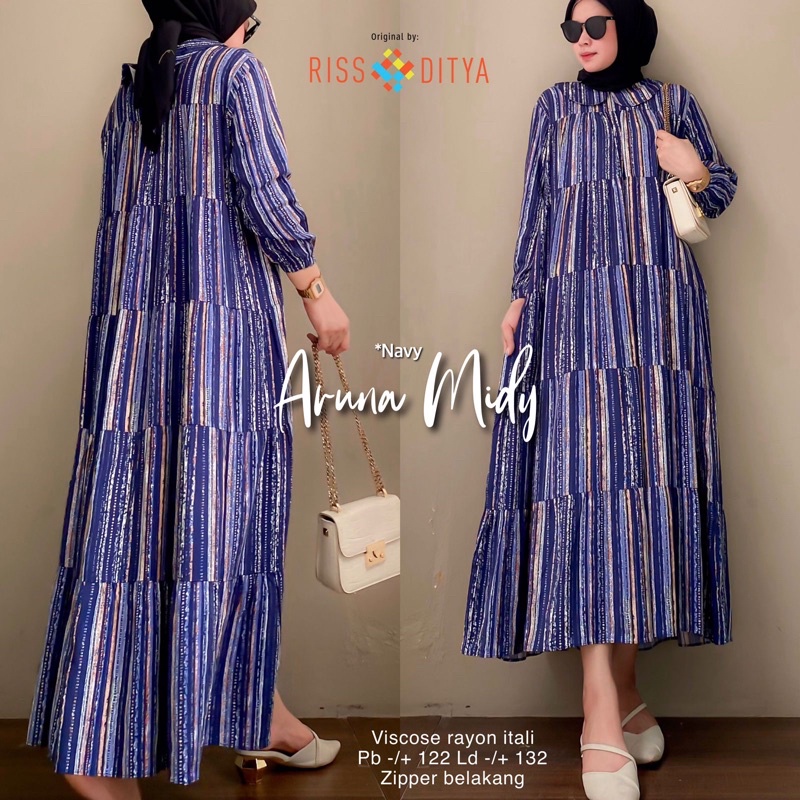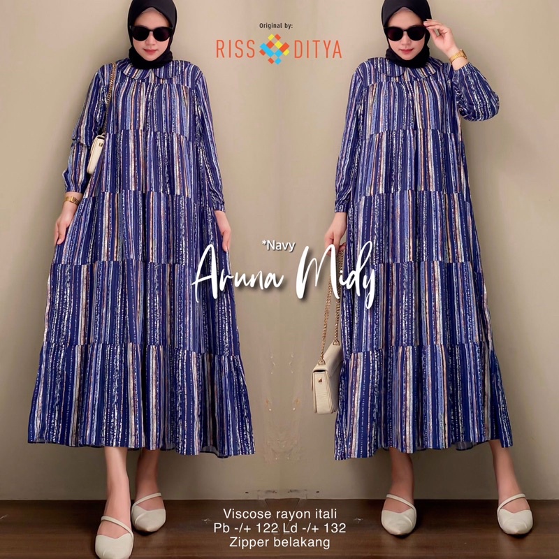 Aruna Midi Dress Sora Midi Dress Wanita Kekinian Motif Garis Salur Jumbo XXXL Ld 122
