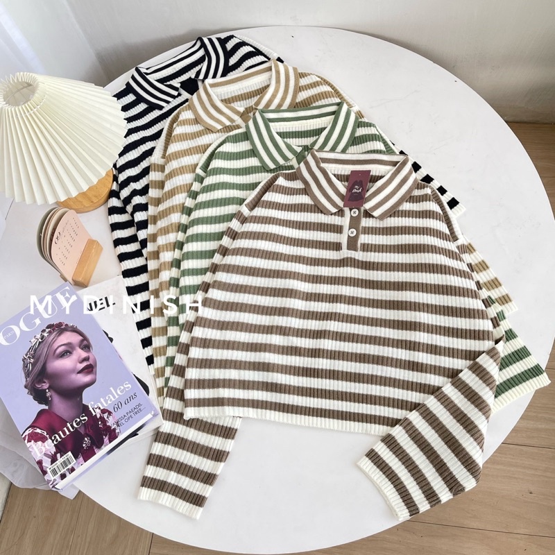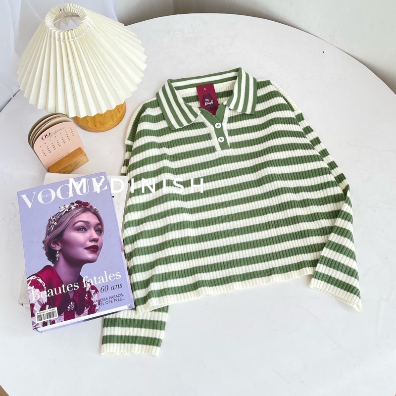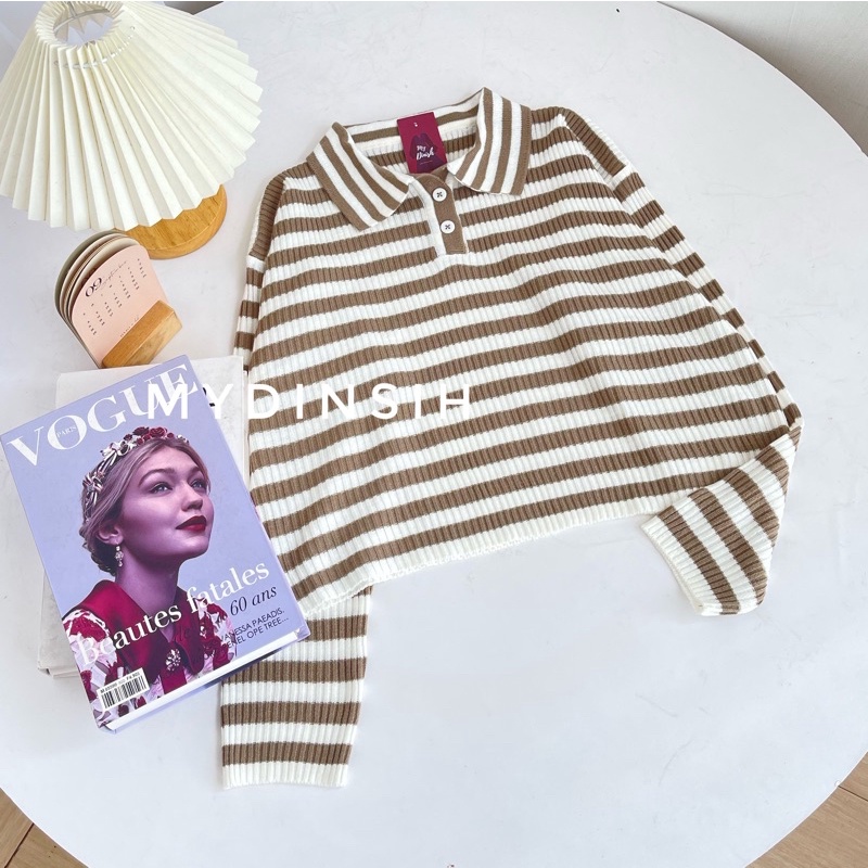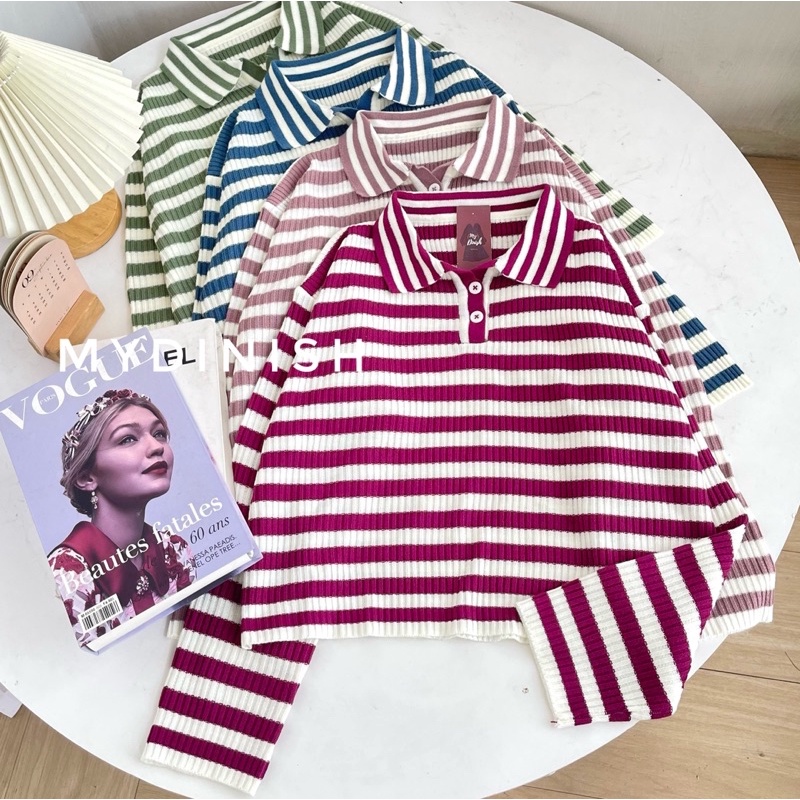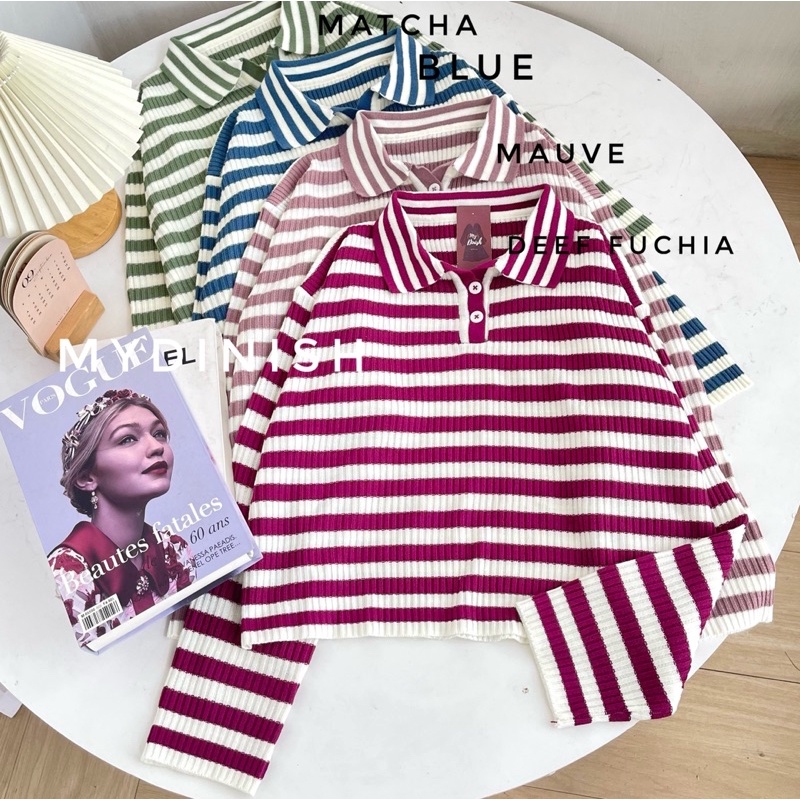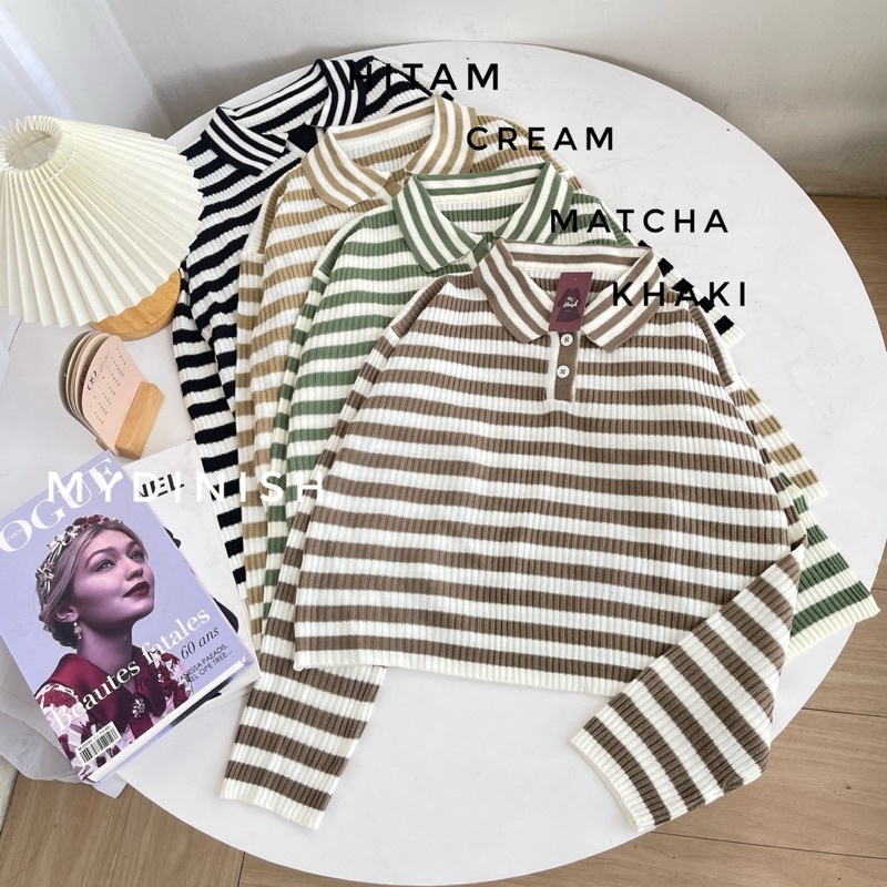 Freya Crop Blouse - Atasan Blouse Wanita Berkerah Polo Motif Stripe
