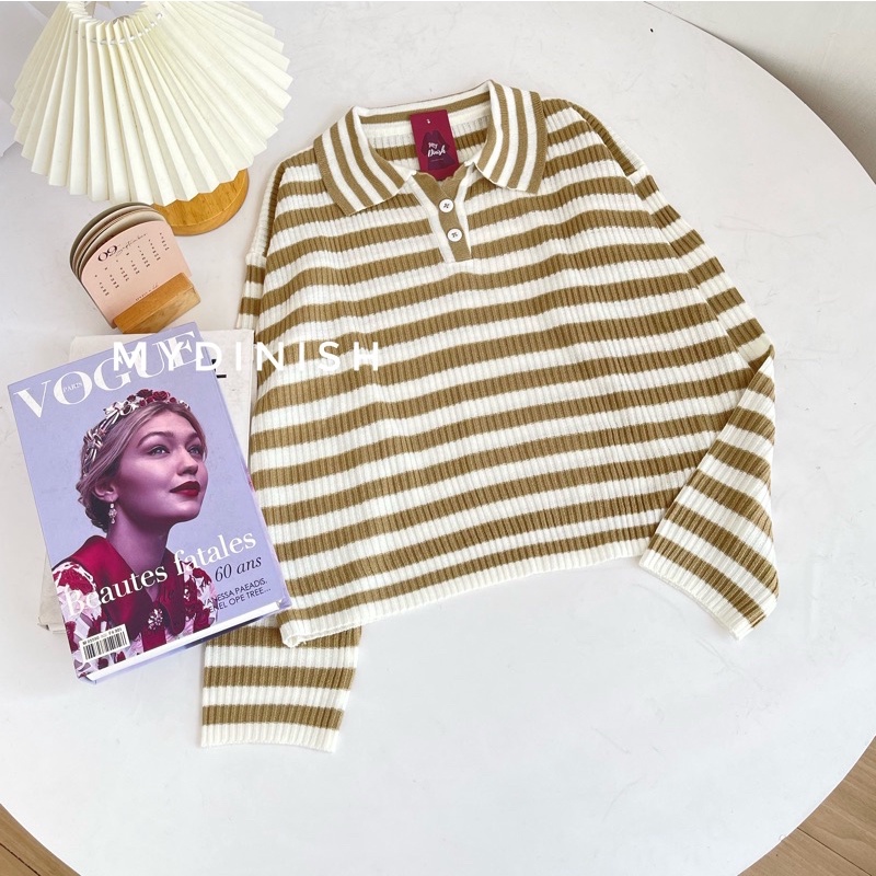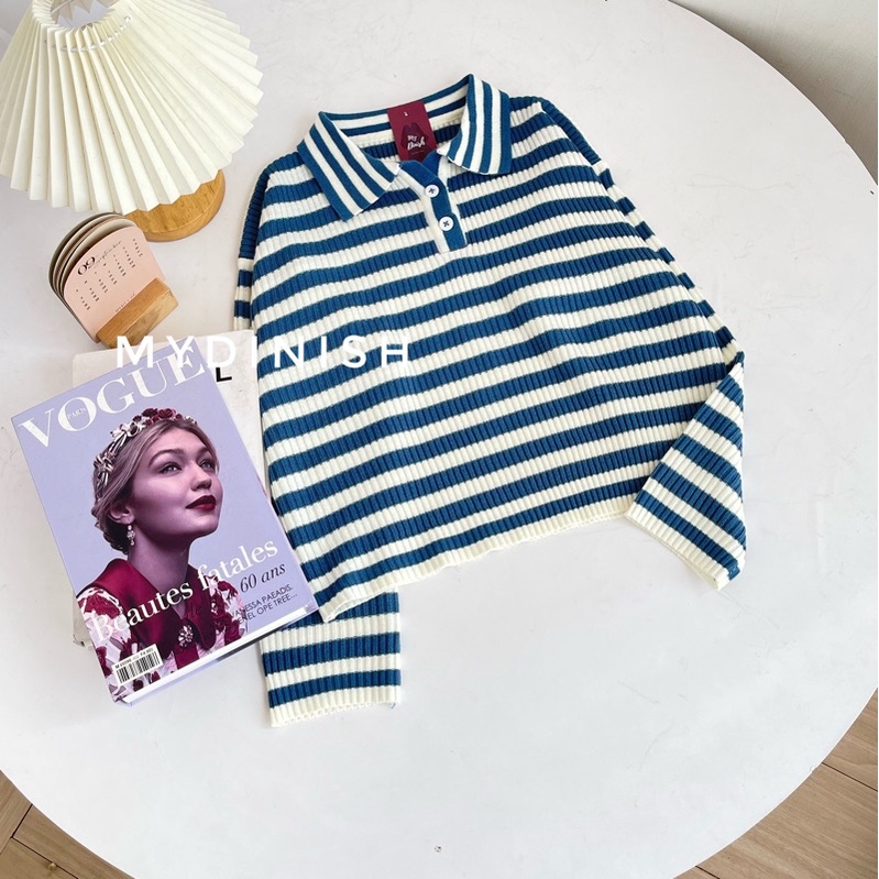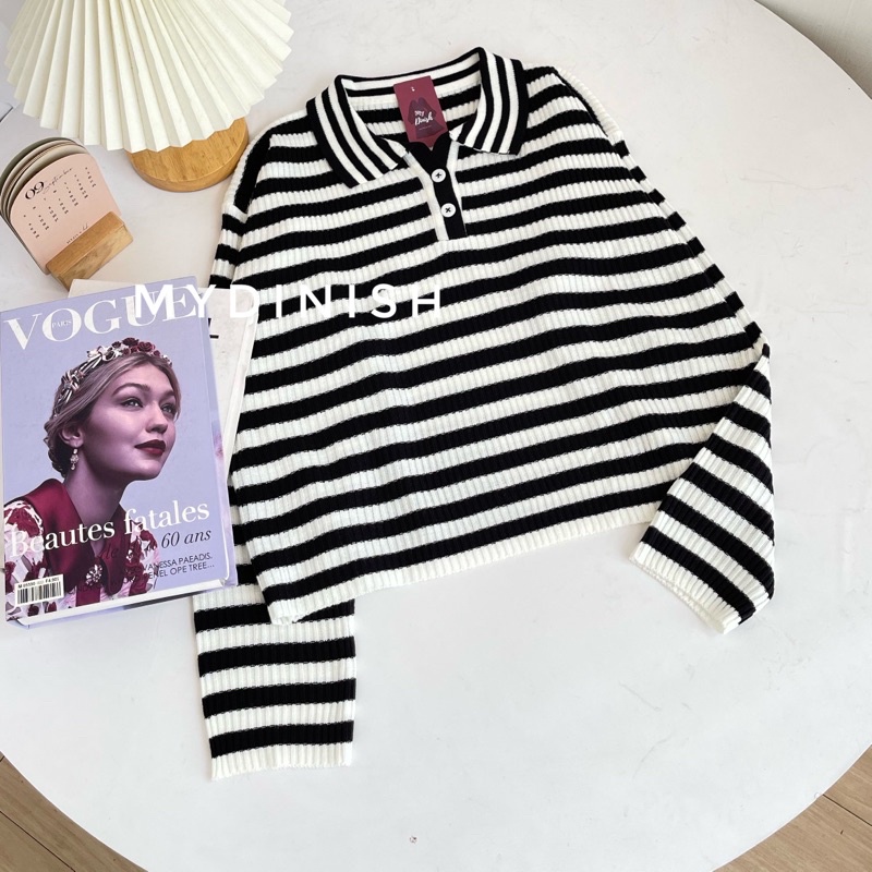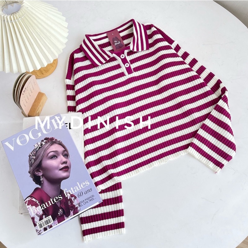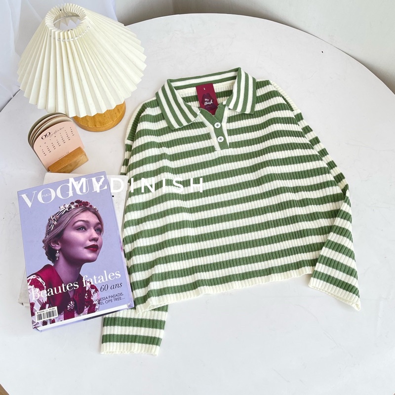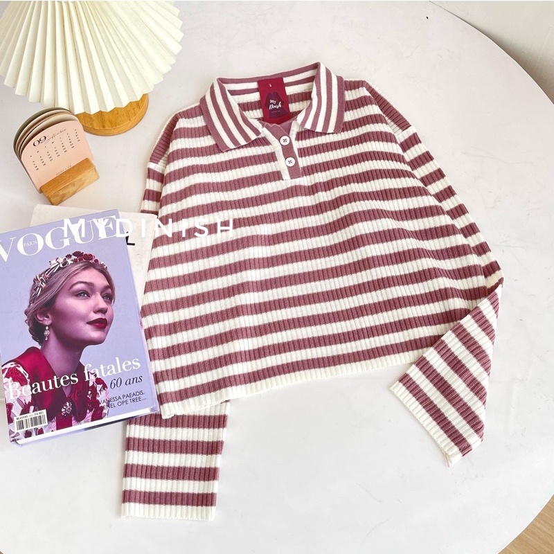 Freya Crop Blouse - Atasan Blouse Wanita Berkerah Polo Motif Stripe