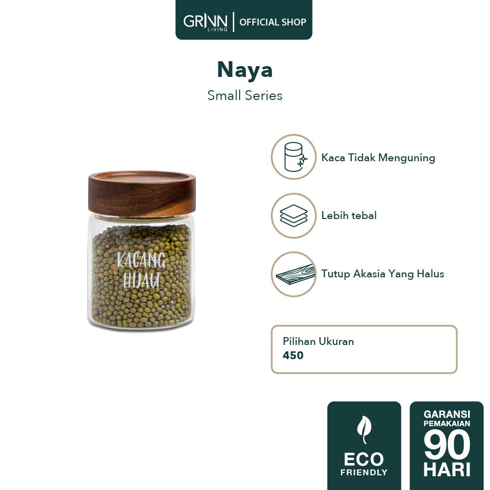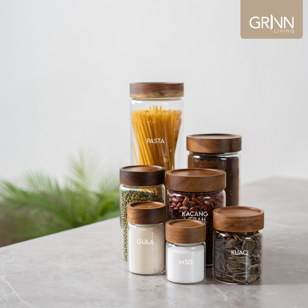 GRINN LIVING Naya Jar /Toples Kaca Kedap Udara /Tutup Kayu Putar /Tempat Kopi Gula /Seri Small Aesthetic