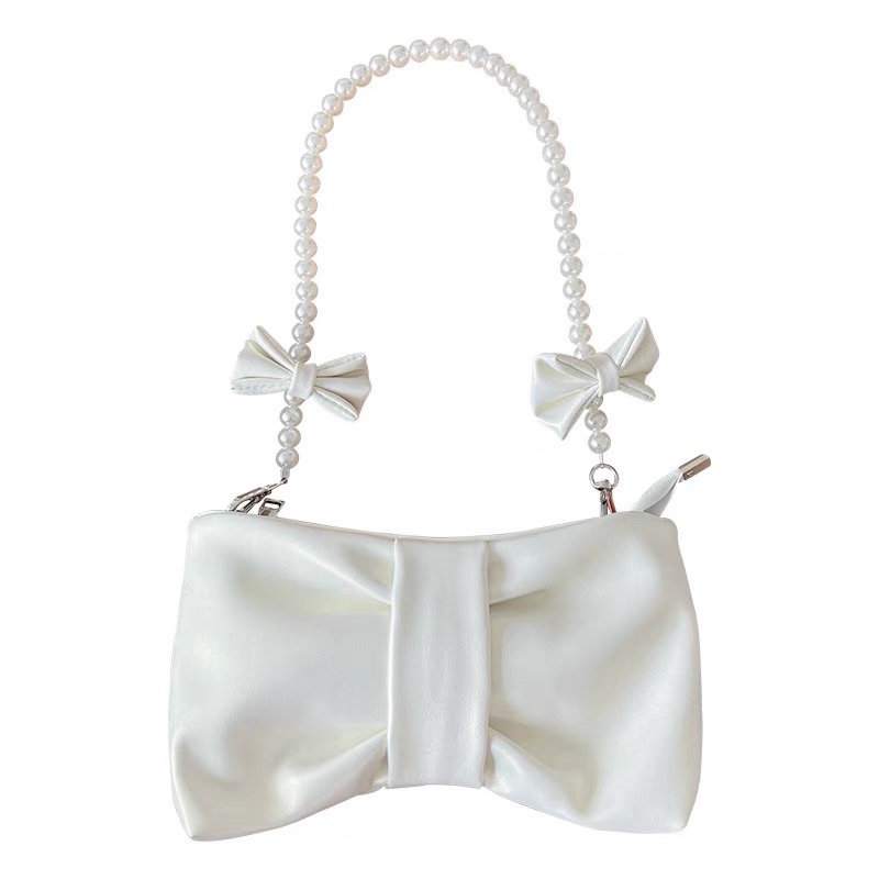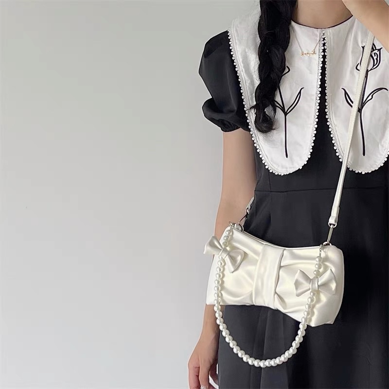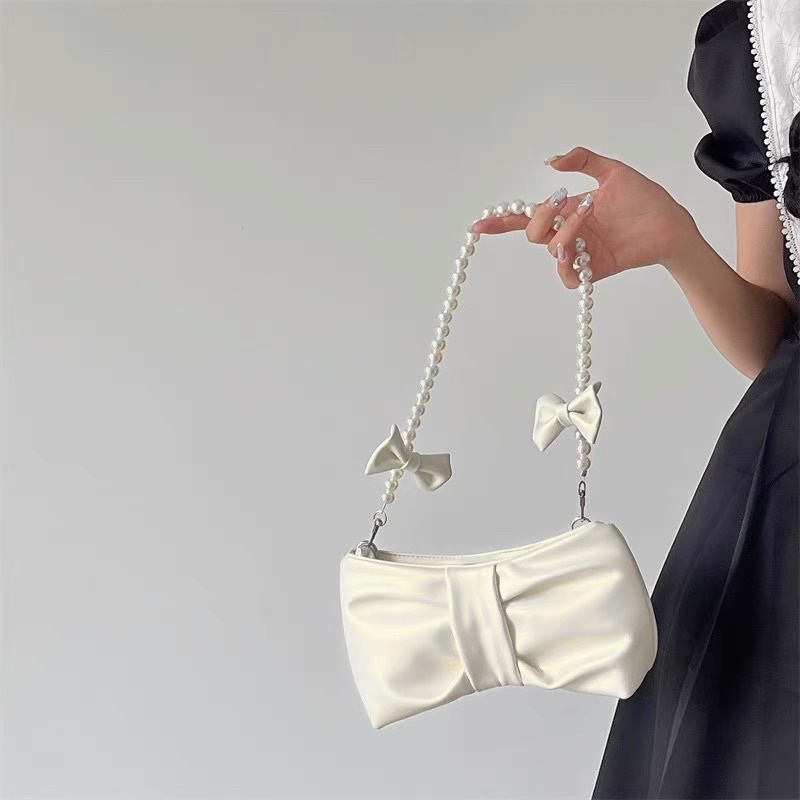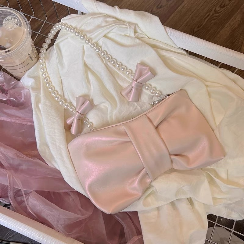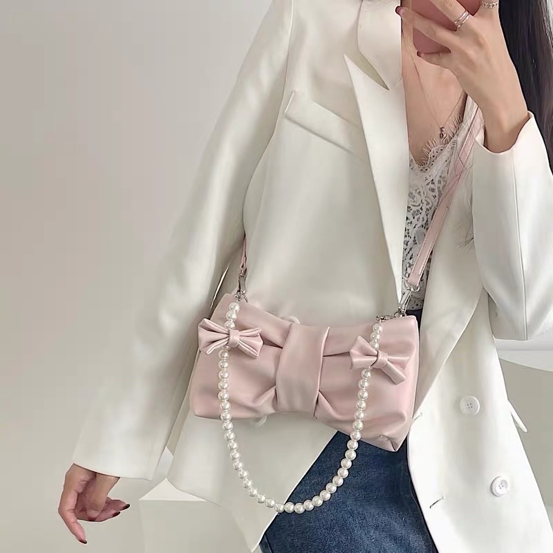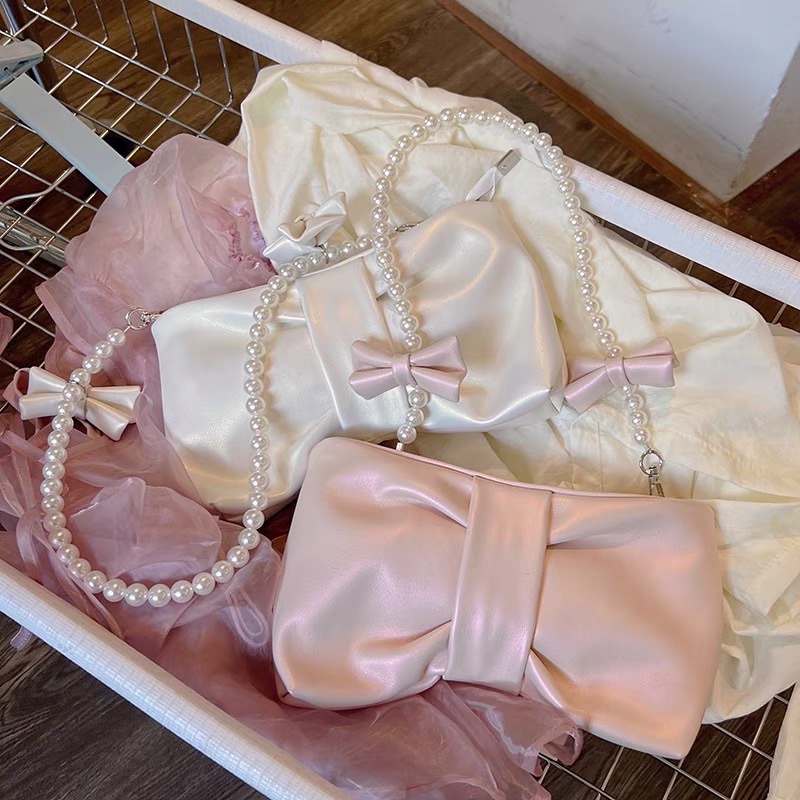 [ready stock] keysa ribbon bag | tas wanita pearl bahu selempang shoulder sling bag bentuk pita warna pink muda metalic putih tali mutiara