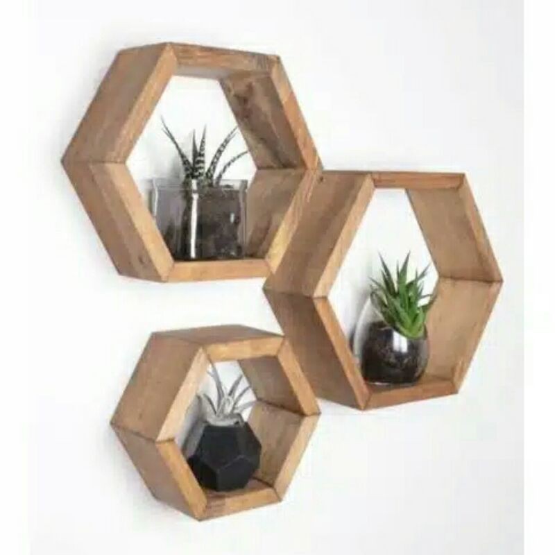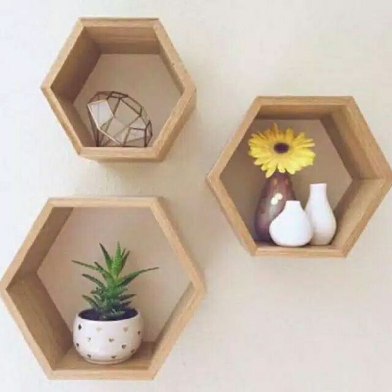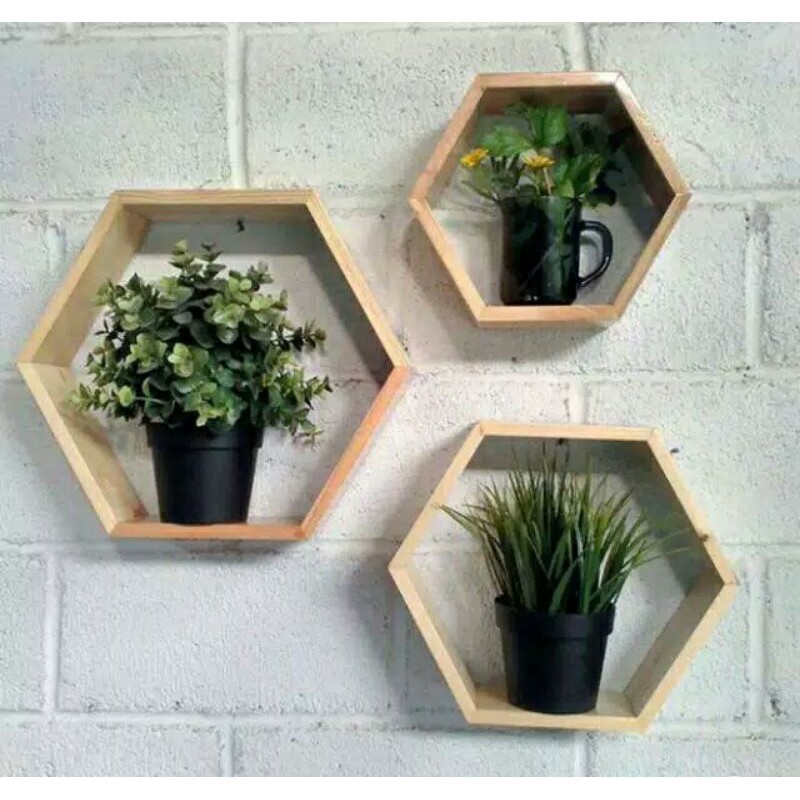 RAK DINDING MINIMALIS HEXAGONAL SEGI ENAM KAYU PINUS 1SET 3PCS MURAH rak hiasan dinding hexagonal rak bunga kosmetik wanita kekinian pajangan kamar tidur kantor ruang tamu sudut tempel pojok tempat skincare samping meja rias
