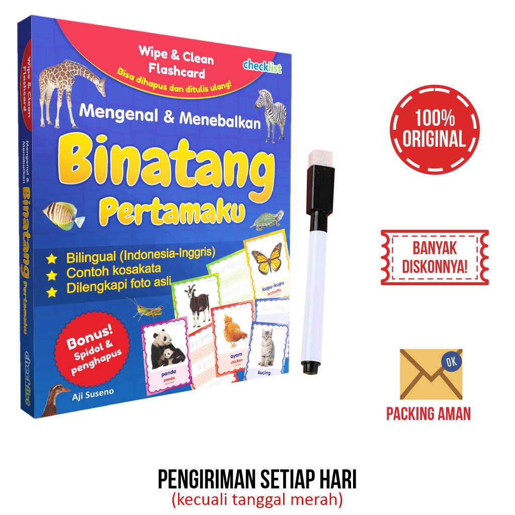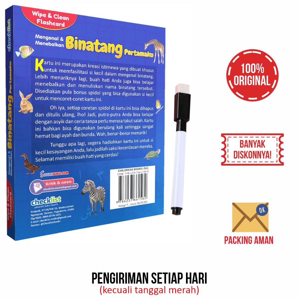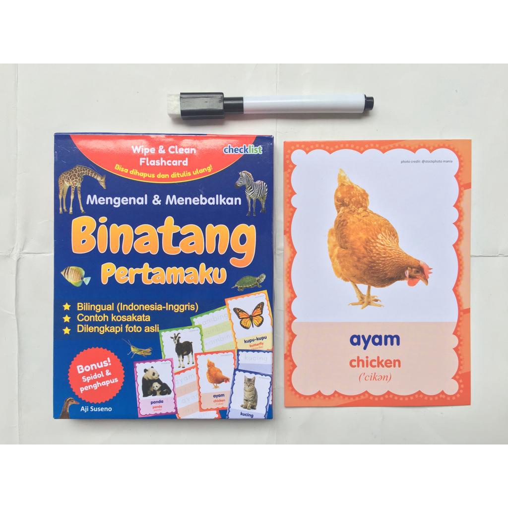 Kartu Wipe & Clean Flashcard Mengenal & Menebalkan Binatang Bonus Spidol Mini