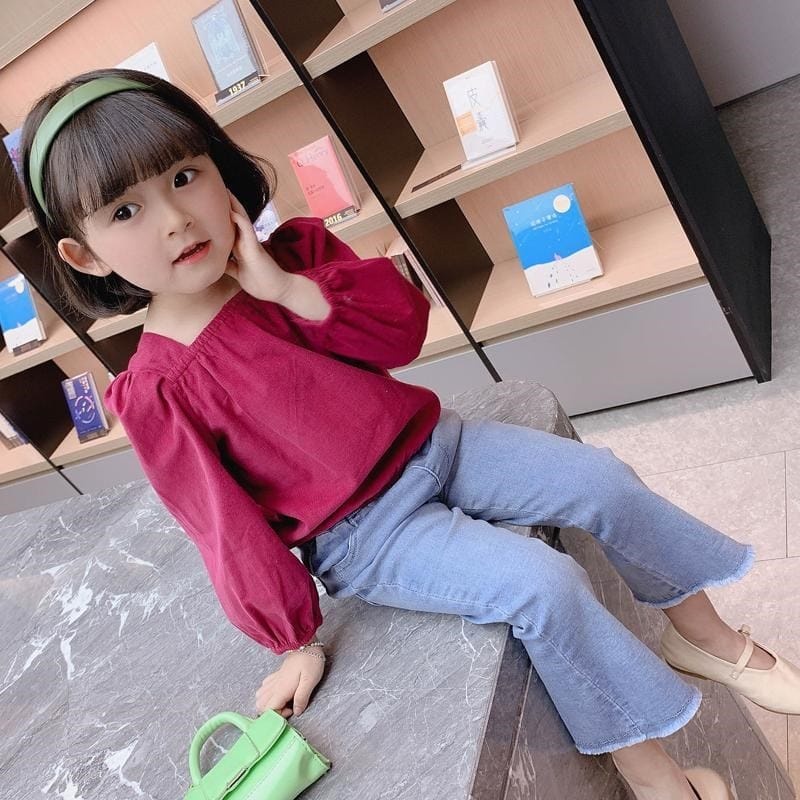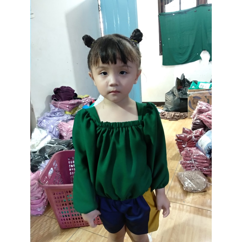 Atasan Baju Sabrina Kerut Anak Cewek Tangan Panjang / Blouse Baju Anak Perempuan Korean Style Usia 1-8 Tahun Bahan Moscrep