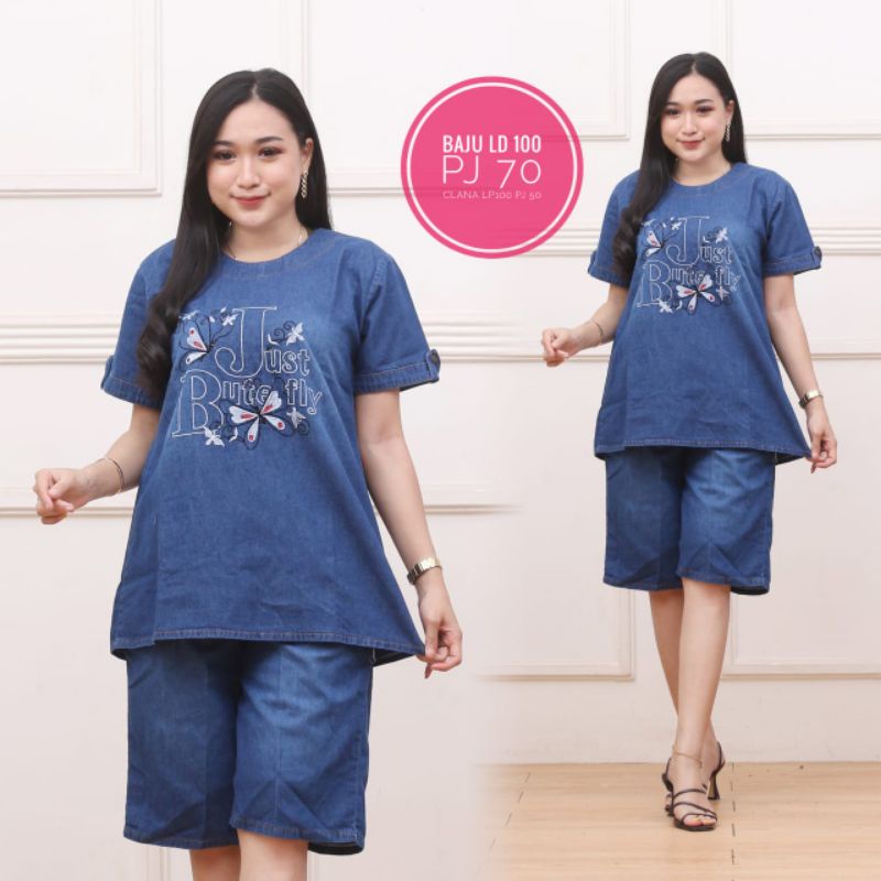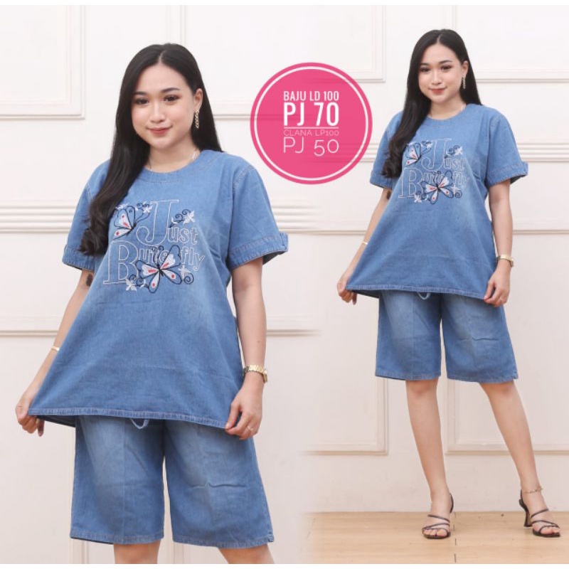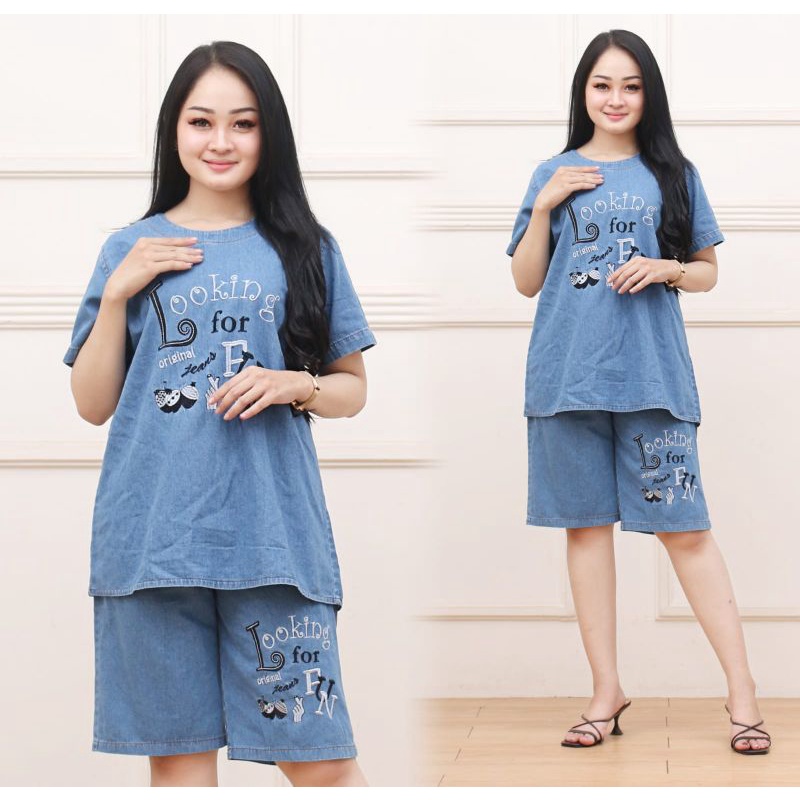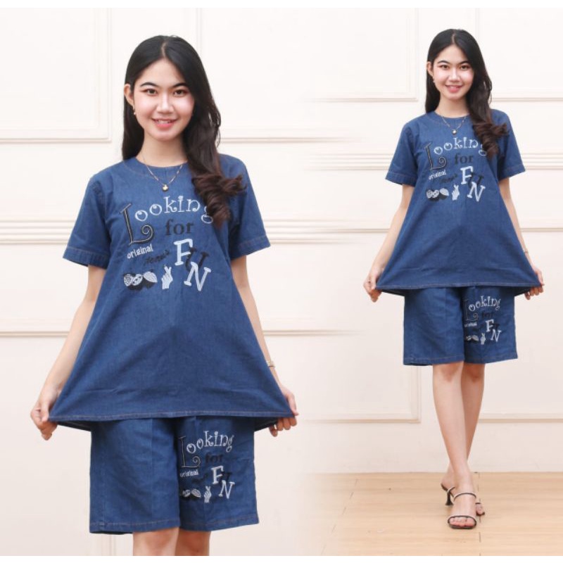 Setelan jeans celana pendek wanita one set model lengan pendek