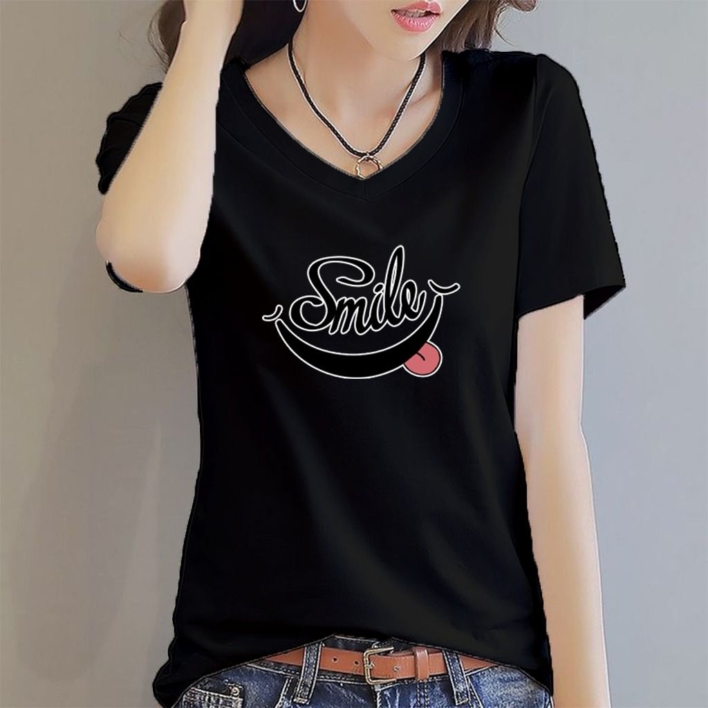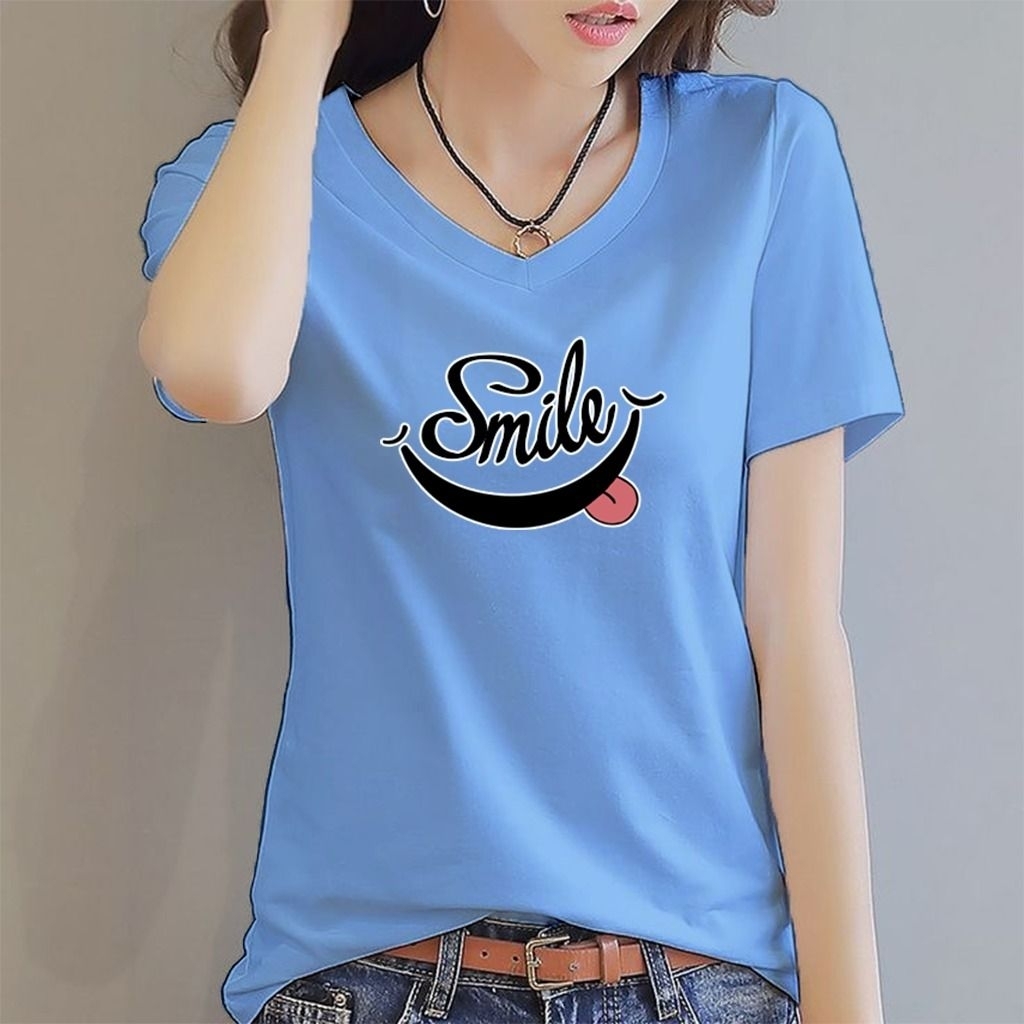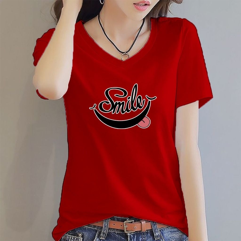 Holiho | Tshirt Kaos Motif Wanita DTF Smile / Atasan Wanita Elegan Size L-4XL/ Kaos Vneck wanita dewasa / Baju Kaos Distro Wanita Terbaru / Tshirt Wanita / Baju Kaos Lengan Pendek Smile