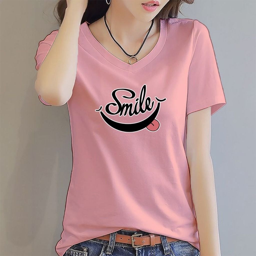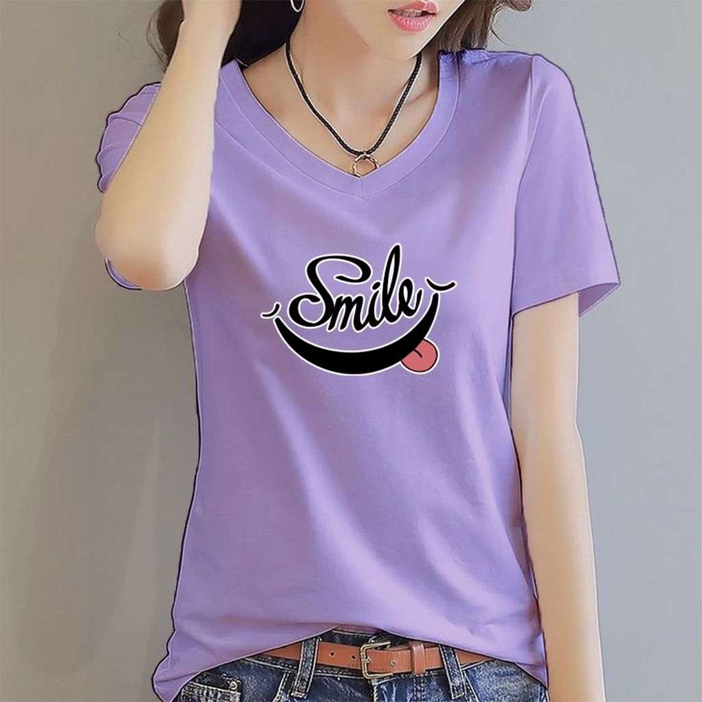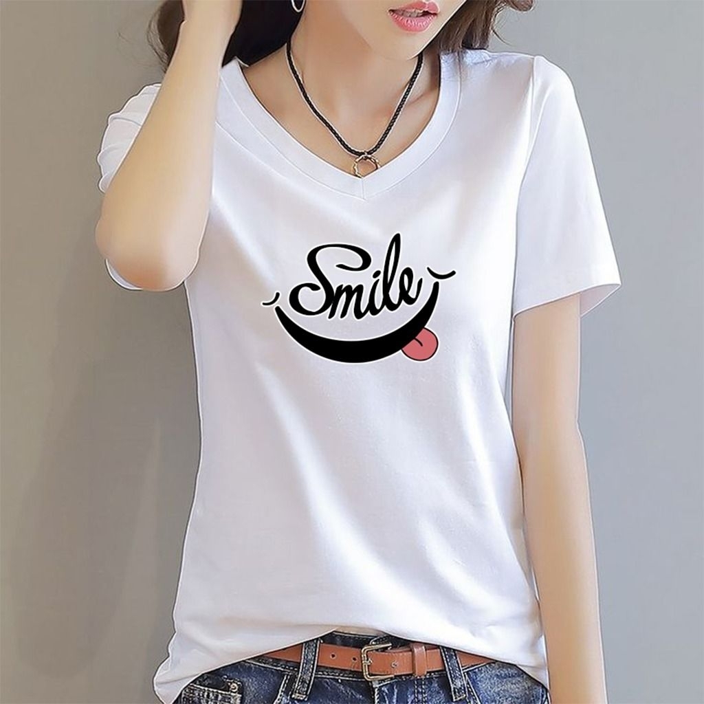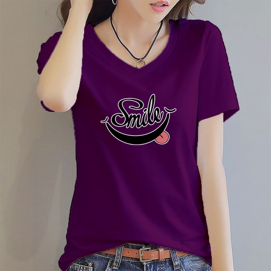 Holiho | Tshirt Kaos Motif Wanita DTF Smile / Atasan Wanita Elegan Size L-4XL/ Kaos Vneck wanita dewasa / Baju Kaos Distro Wanita Terbaru / Tshirt Wanita / Baju Kaos Lengan Pendek Smile