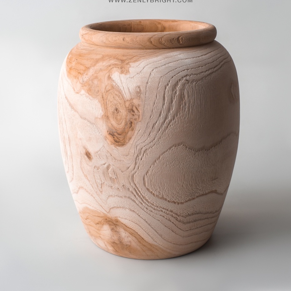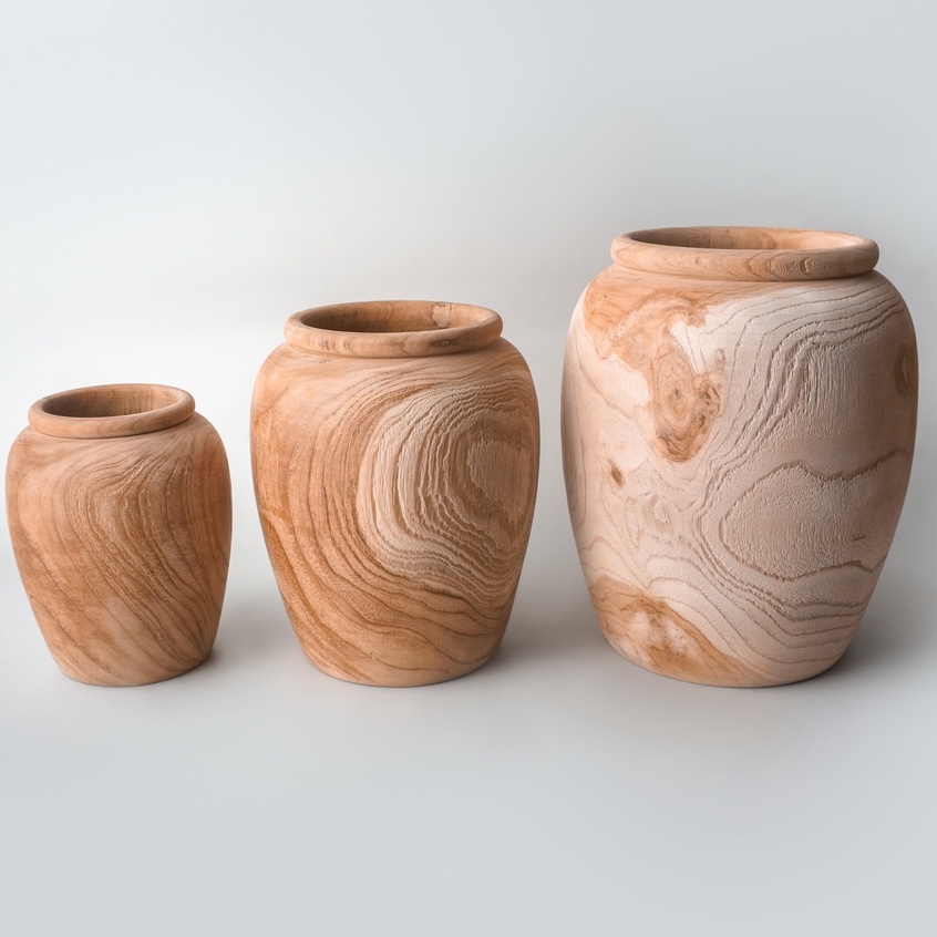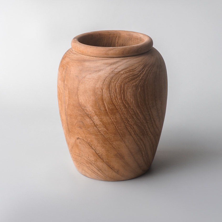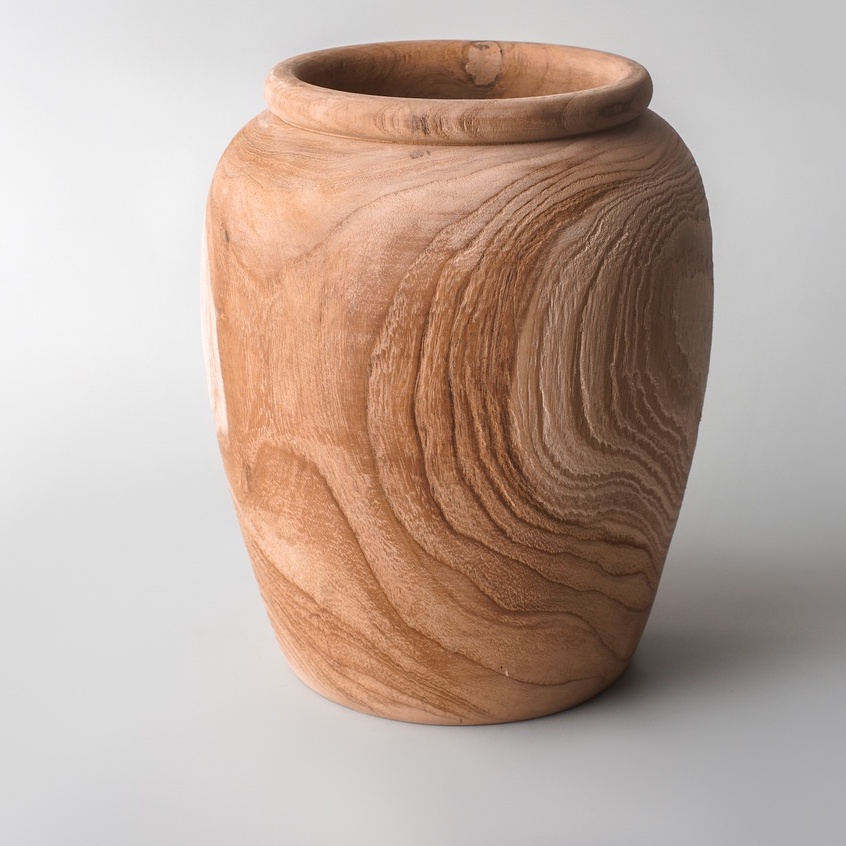 vas bunga kayu jati | vas gentong kayu jati solid | vas guci medium | wooden vase