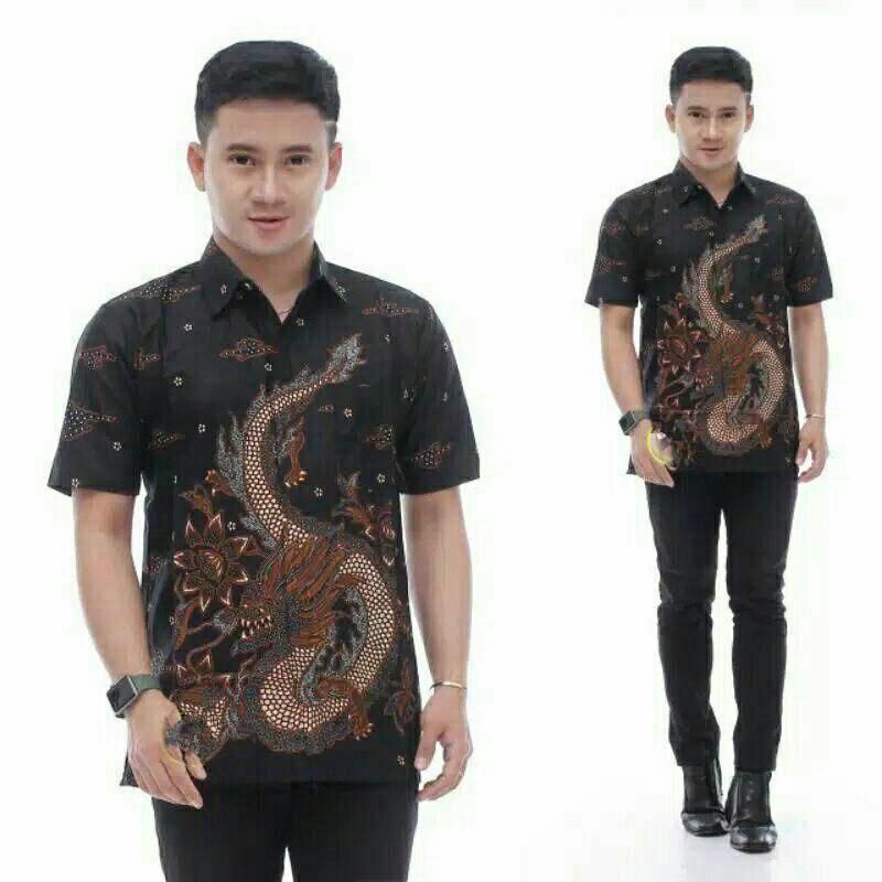 Batik Berjaya kemeja lengan pendek batik naga ukuran M, L, XL Hitam