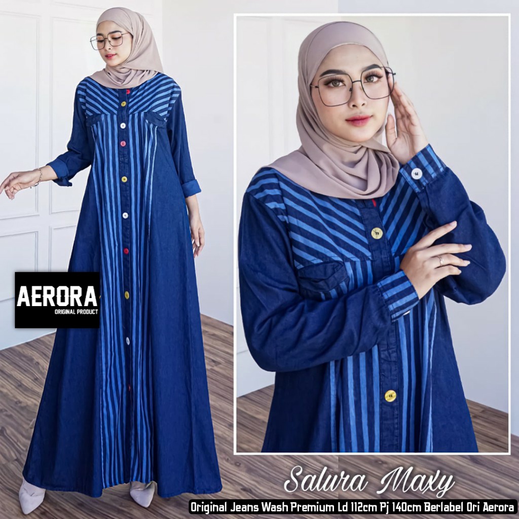 Aerora Baju Gamis Dewasa Jeans Wanita Terbaru 2026 Dress Muslim Kondangan Busui Motif Salura Maxy