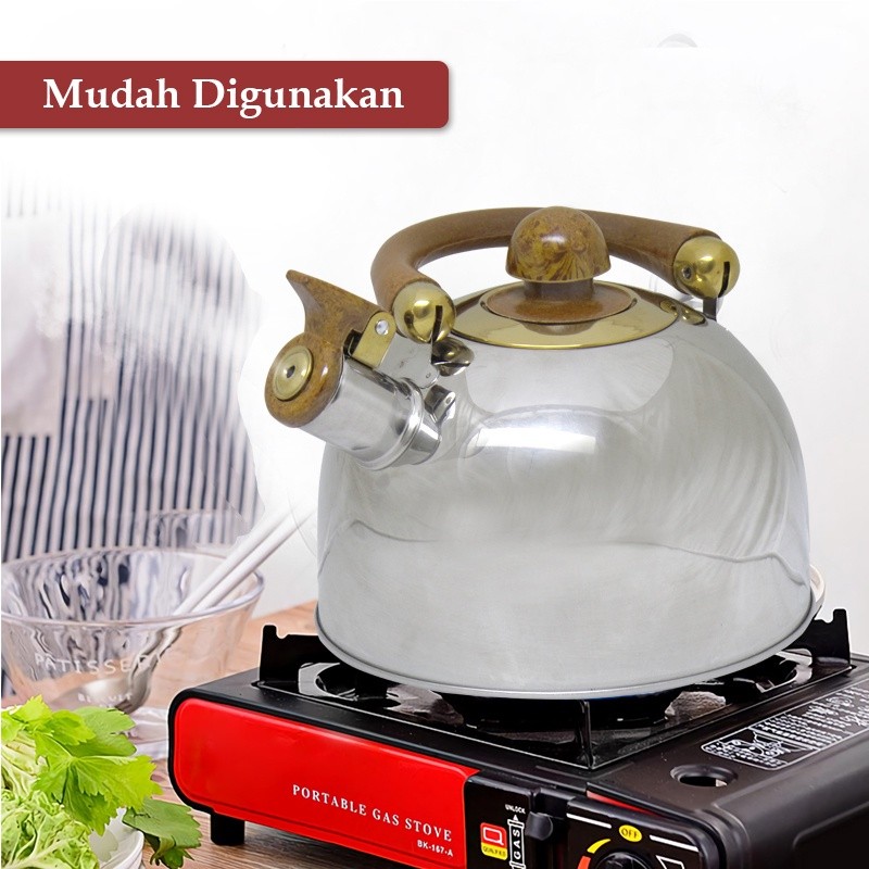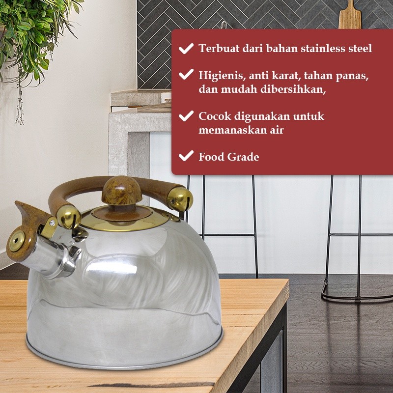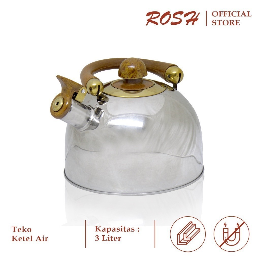 ROSH Teko / Ketel / Ceret 3 Liter Whistling Kettle Wooden Stainless Steel Anti Karat ROS