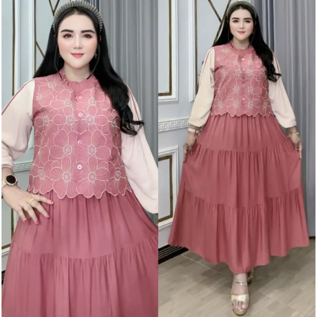 Baju Midi Dress Rompi Bordir Neri Bervariasi Rayon Twill Busui/Tidak Busui Tali Pinggang Leher Kra/Tidak Kra Depan Rempel Mayung Ld 110 Pb 125