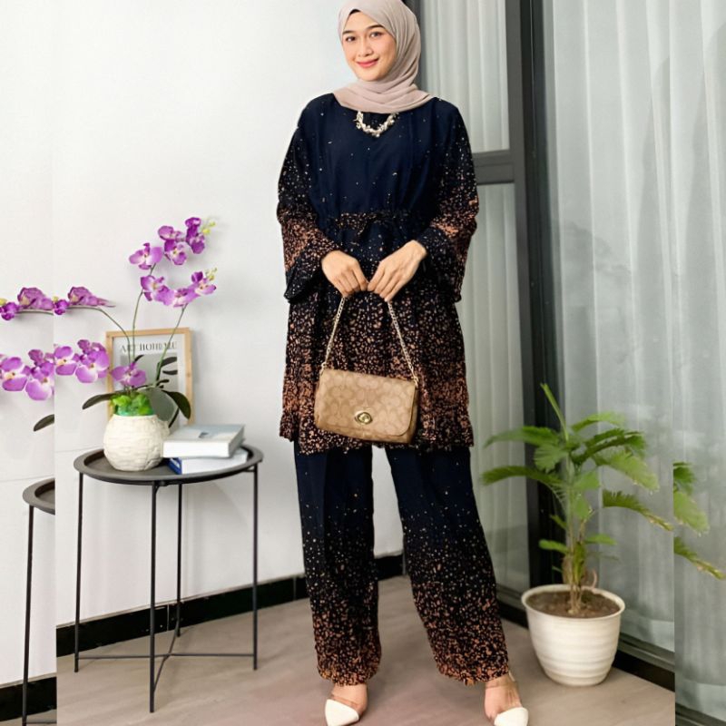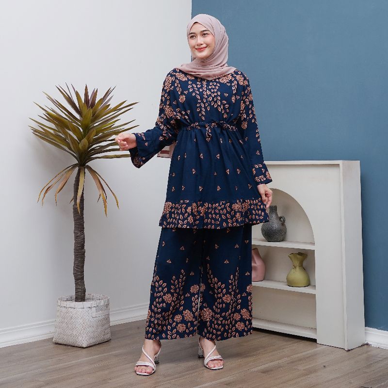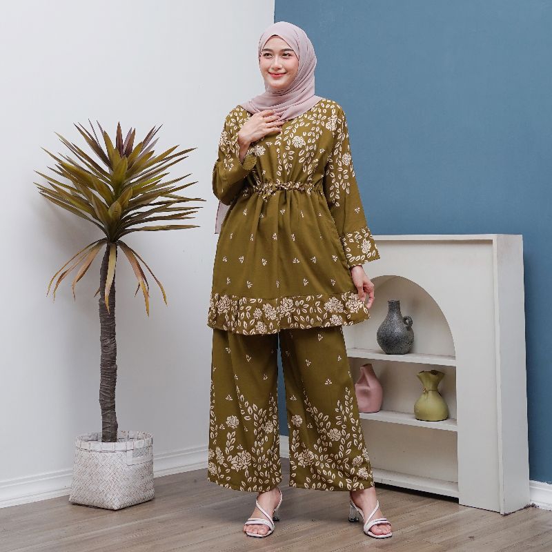 Setelan Wanita Rayon Jumbo One Set Tunik Ld 120 Motif Daun Busui Tali Serut